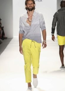 Colore brillante e saturo, che è una versione estiva dell'abbigliamento. Tuttavia, non tutti gli uomini adulti sono pronti a indossare pantaloni solari. E per i giovani che vogliono essere sotto i riflettori, questa versione dei pantaloni sarà di loro gusto.