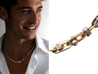 Vari tipi di oro vengono utilizzati per la produzione di costosi accessori da uomo. Il più richiesto è il metallo giallo - la tradizionale combinazione di colori testimonia l'esclusività, i classici e l'alto costo del prodotto. A volte gli uomini scelgono gioielli dorati economici, ma le catene "travestite" da metallo giallo non durano a lungo e perdono rapidamente il loro aspetto inizialmente presentabile.