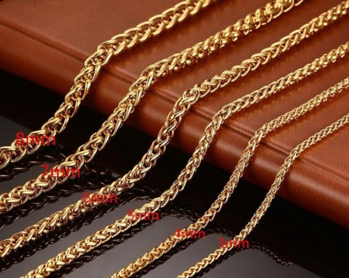 Per quanto riguarda il diverso dimensioni e massa, quindi questi parametri dipendono in massima misura dal tipo di tessitura e dalla dimensione delle maglie... Molto spesso, nei negozi puoi trovare catene con uno spessore da 2 a 20 mm, ma secondo gli stereotipi prevalenti, la dimensione tipica dei gioielli di un uomo dovrebbe essere di almeno 4 mm. I modelli più sottili vengono acquistati principalmente per i ragazzi: