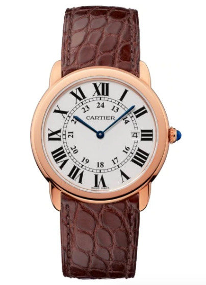 Raffinata versione tonda da 36 mm su un cinturino in materiale naturale denso. L'orologio era dotato di due tipi di quadranti: da numeri romani e arabi. E anche i produttori hanno aggiunto una finestra che mostra il giorno del mese.