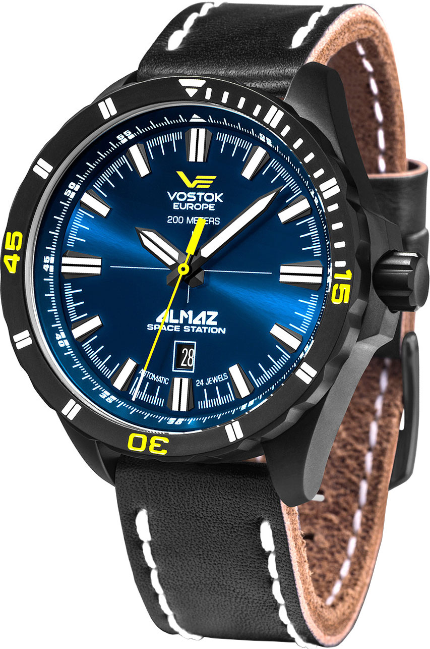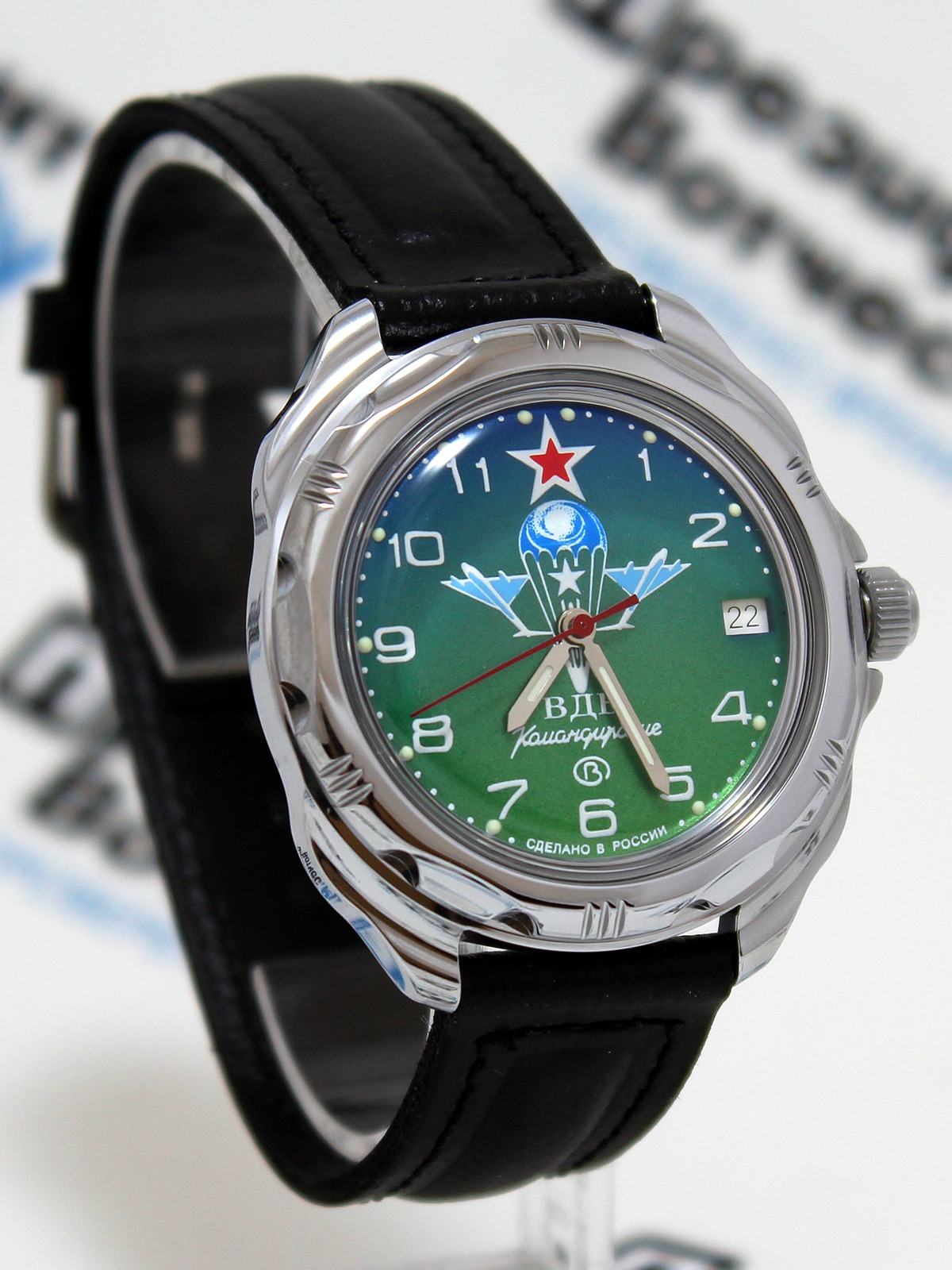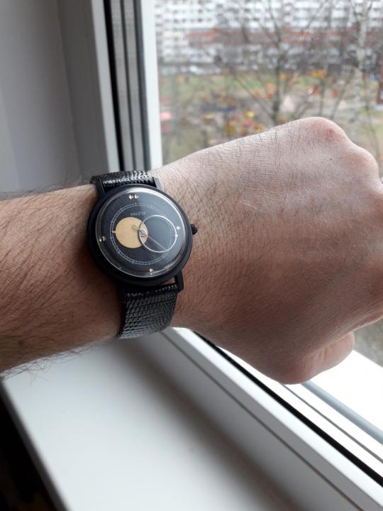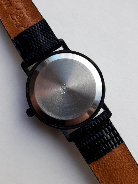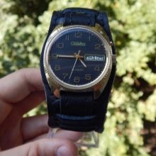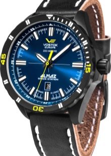 - "Europa dell'est. Spettacolare modello di orologio da polso da uomo di un marchio nazionale. Differisce nelle prestazioni di design originali e brutali. Il prodotto è incluso in un'edizione limitata. Ha un bel quadrante blu e un datario separato. La cover posteriore dell'accessorio è trasparente.