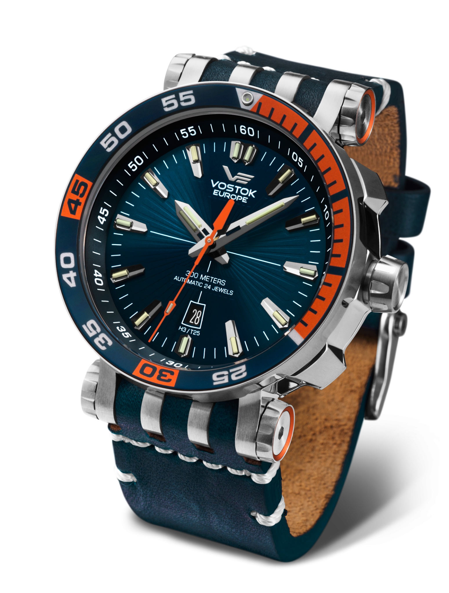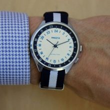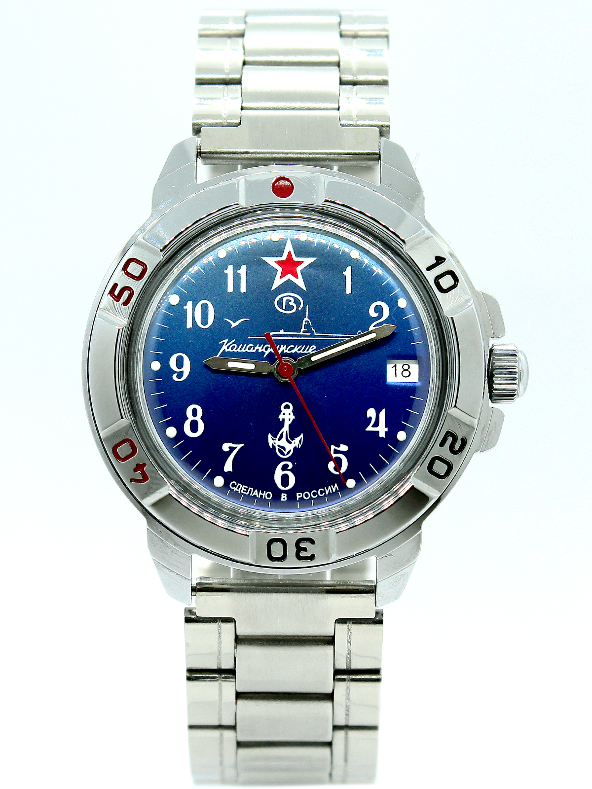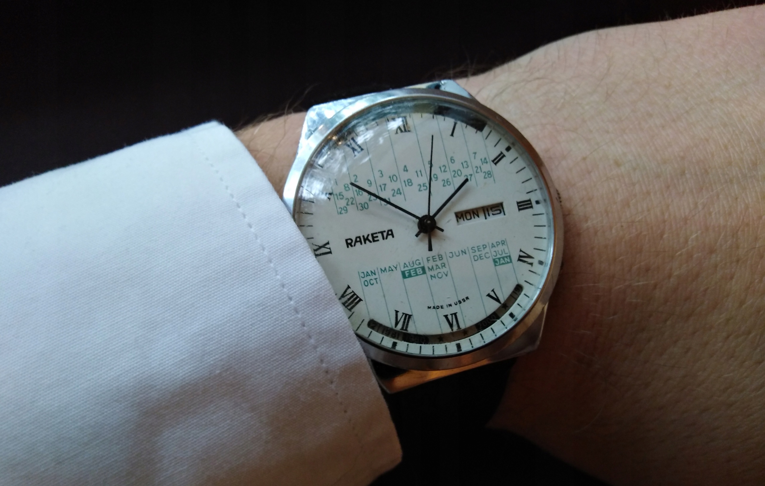 - "Europa dell'est. Spettacolare modello di orologio da polso da uomo di un marchio nazionale. Differisce nelle prestazioni di design originali e brutali. Il prodotto è incluso in un'edizione limitata. Ha un bel quadrante blu e un datario separato. La cover posteriore dell'accessorio è trasparente.