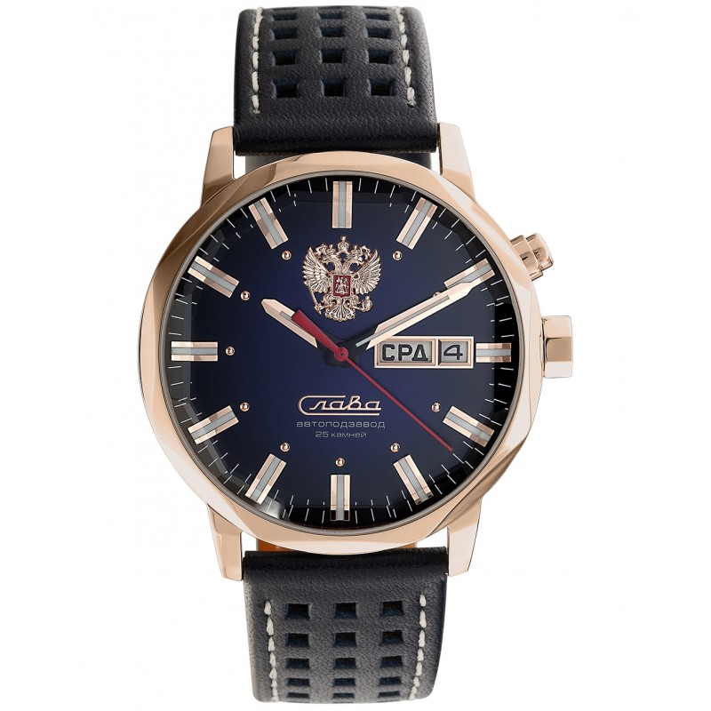 - "Gloria" - "Tradizione". Orologio da uomo affidabile e resistente agli urti con movimento preciso e durevole. Il modello è progettato in uno stile classico, sembra austero ed elegante. L'accessorio è dotato di un movimento Slava 2414 di alta qualità su 21 pietre di rubino.