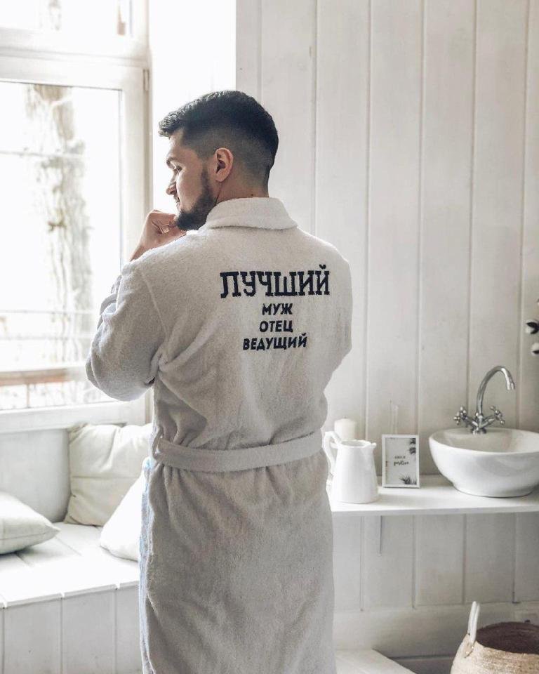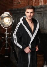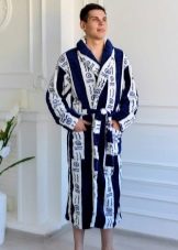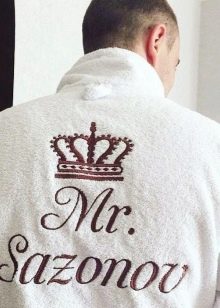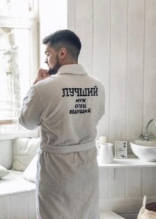 L'iscrizione sul retro sembra interessante, ti consente di realizzare ricami o stampe piuttosto istruttive. Se desideri soluzioni più minimaliste, puoi scegliere una vestaglia con un logo o delle iniziali sobrie ma riconoscibili sul petto. Tra i simboli popolari per decorare i vestiti di casa ci sono la corona, simboli araldici. Una stampa di giornale sul tessuto utilizzato per cucire una vestaglia da uomo sembra interessante. Il carattere della firma del New York Times sembra particolarmente impressionante in questo design.
