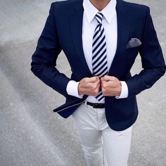- Poiché il fisico di ognuno è diverso, e i mercatini presentano prodotti tipici con una griglia dimensionale standard, è importante che la tuta calzi correttamente. Le cuciture delle spalle dovrebbero essere a posto e non sono consentite pieghe inutili nella loro area con le braccia tese. La lunghezza ideale della manica è considerata fino al polso in modo che i polsini della camicia siano visibili. In questo caso, la cravatta dovrebbe raggiungere la cintura e persino coprirla.