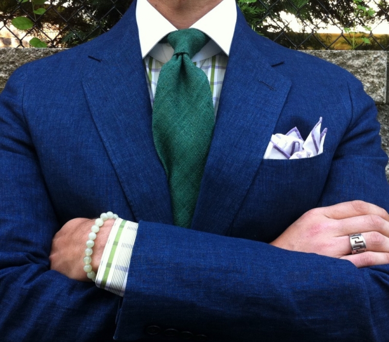 Fantasia combinazioni di cravatte accese come il verde o l'arancione in effetti sembra piuttosto buono. Inoltre, questo è adatto sia per uno stile formale che casual. In questo caso, è necessario assicurarsi che non solo le sfumature siano combinate tra loro, ma anche i tipi di materiale. Ad esempio, per una giacca casual è necessaria la stessa cravatta realizzata in tessuto semplice senza lucentezza. In questo caso, il colore della tuta può essere chiaro: azzurro, blu o addirittura indaco.