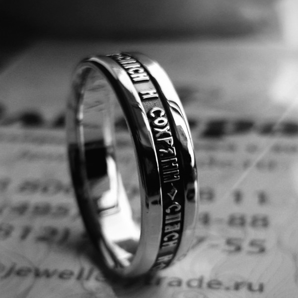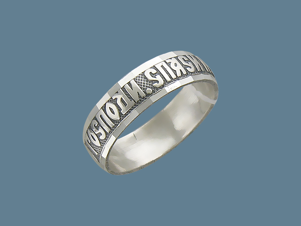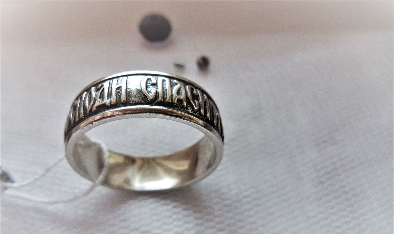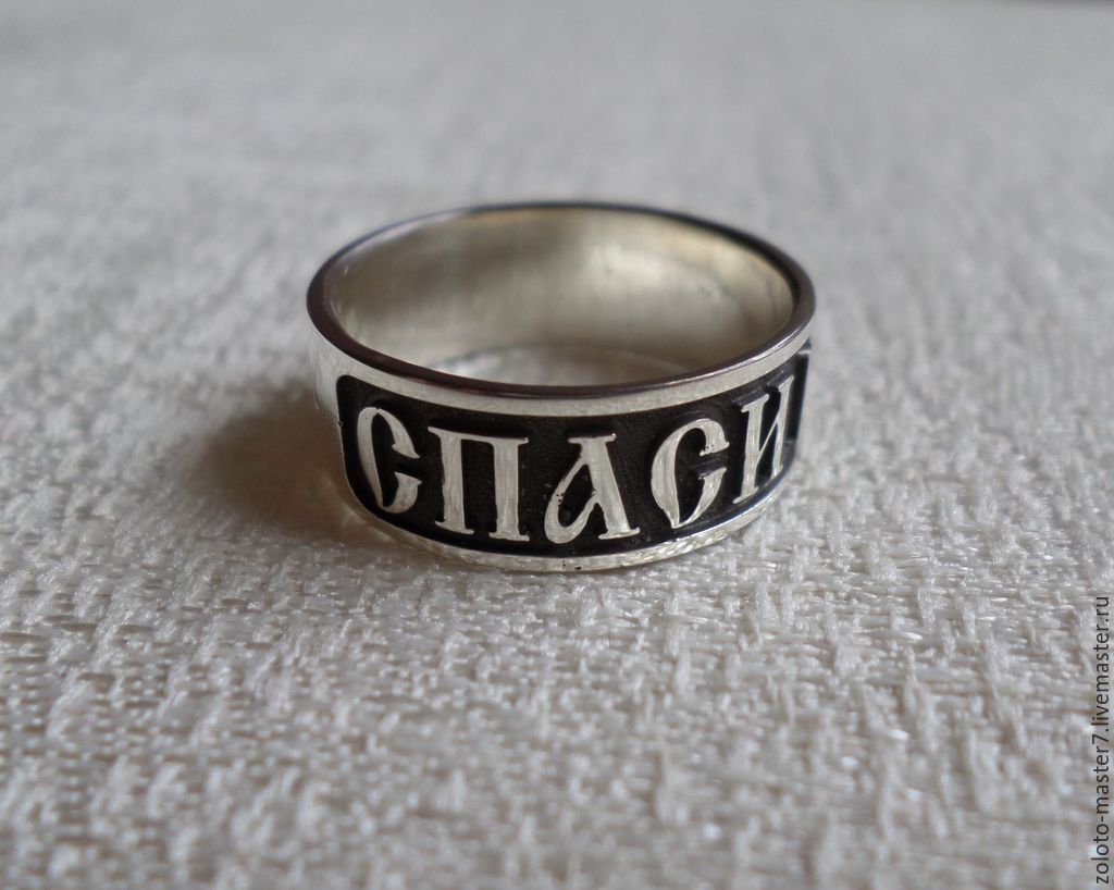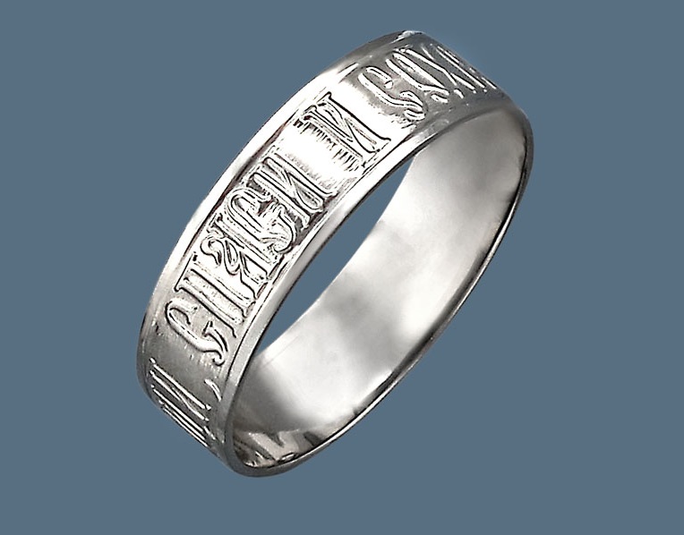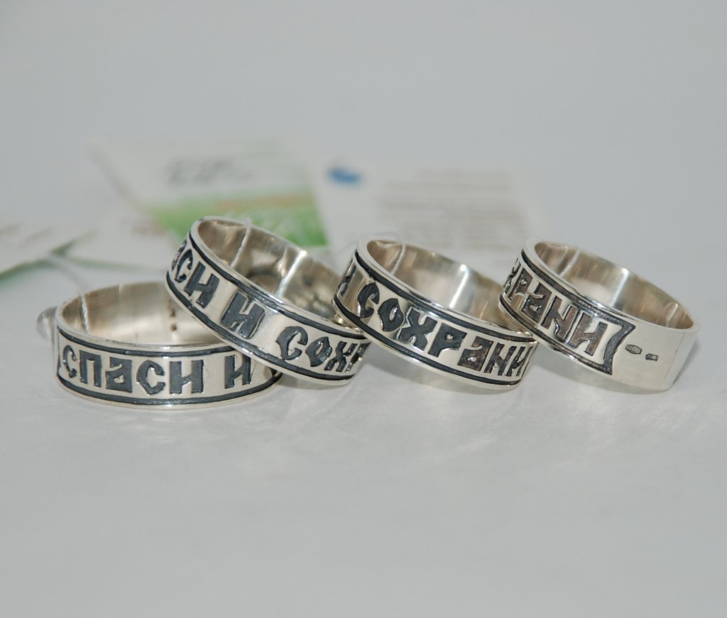 Decorazione con la frase "Salva e conserva" lungo il bordo, come appello al volto dell'Onnipotente... Queste due parole rappresentano una potente forza dell'Ortodossia, paragonabile anche a croci e amuleti indossati. A volte, in una situazione difficile, un'iscrizione indirizzata a Dio aiuta a fare la scelta giusta. Oggi, gli anelli "Salva e conserva" per gli sposi sono particolarmente apprezzati.... Come simbolo di lealtà e sentimenti leggeri, devozione e protezione della famiglia. Alcune persone acquisiscono tali anelli per enfatizzare i loro sentimenti religiosi, il coinvolgimento nella grande fede ortodossa.