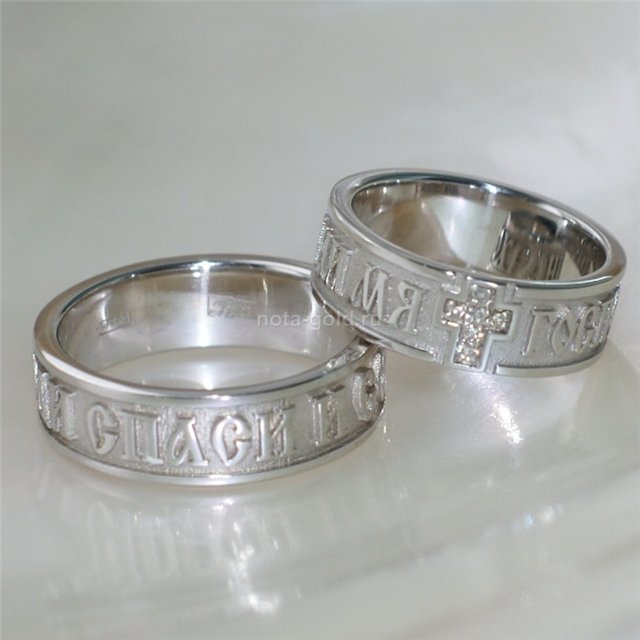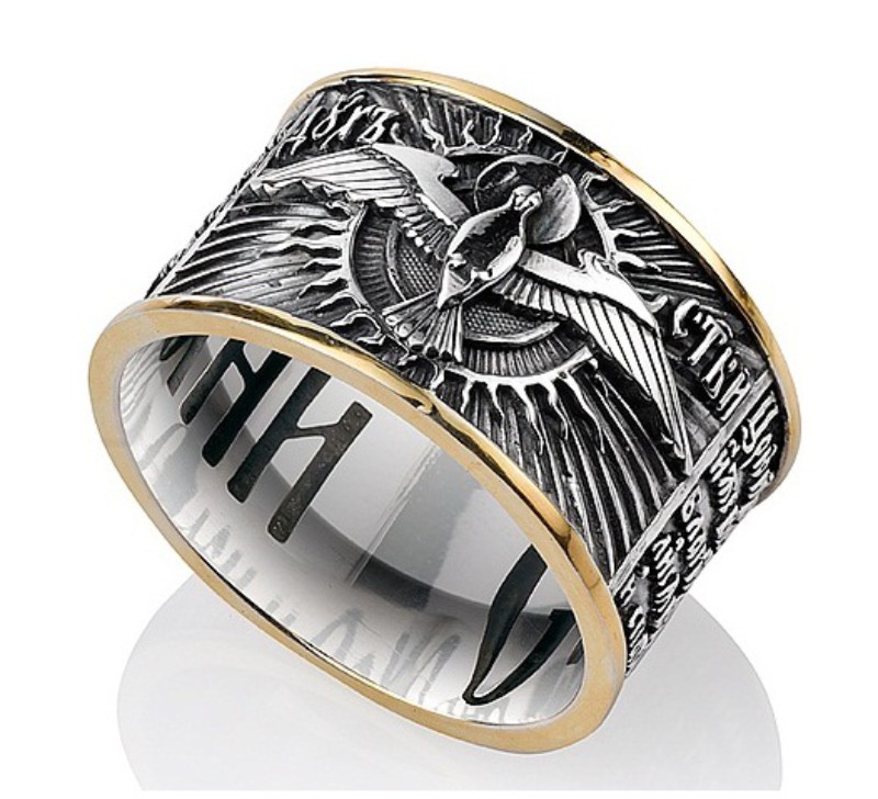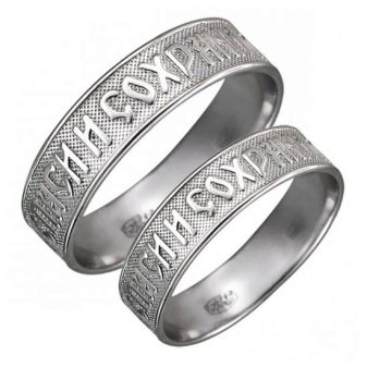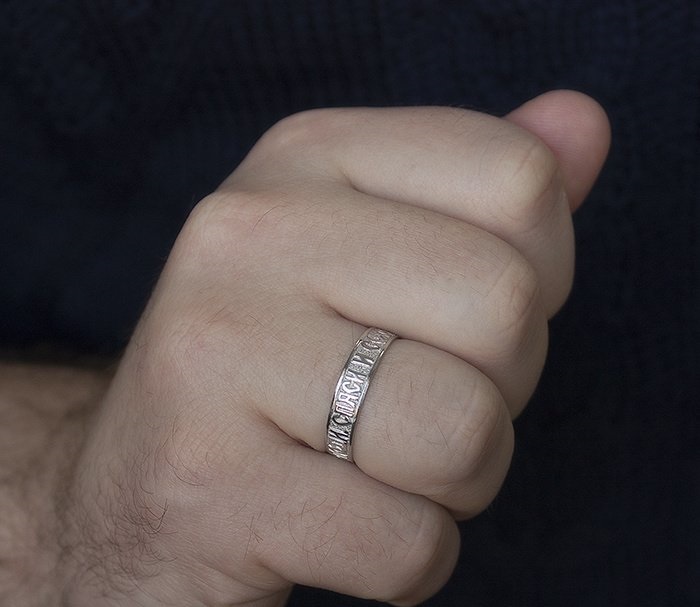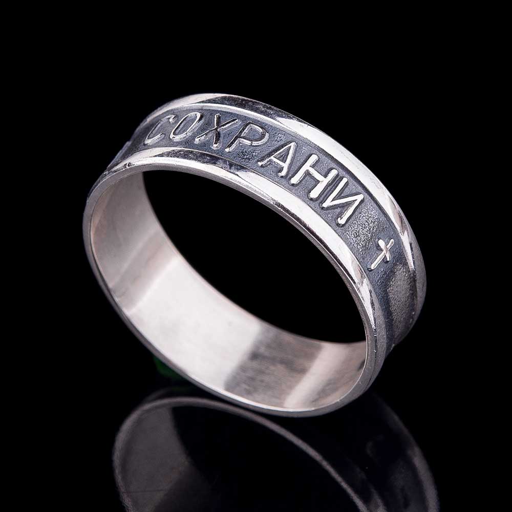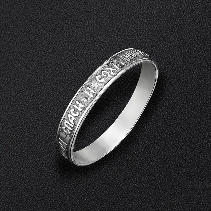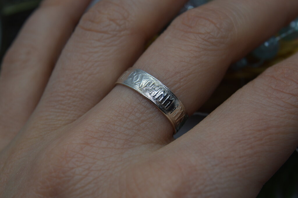 Decorazione con la frase "Salva e conserva" lungo il bordo, come appello al volto dell'Onnipotente... Queste due parole rappresentano una potente forza dell'Ortodossia, paragonabile anche a croci e amuleti indossati. A volte, in una situazione difficile, un'iscrizione indirizzata a Dio aiuta a fare la scelta giusta. Oggi, gli anelli "Salva e conserva" per gli sposi sono particolarmente apprezzati.... Come simbolo di lealtà e sentimenti leggeri, devozione e protezione della famiglia. Alcune persone acquisiscono tali anelli per enfatizzare i loro sentimenti religiosi, il coinvolgimento nella grande fede ortodossa.