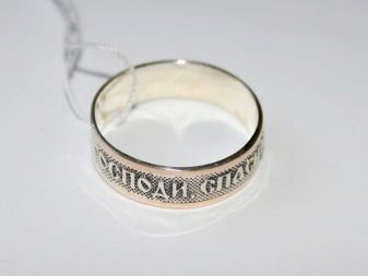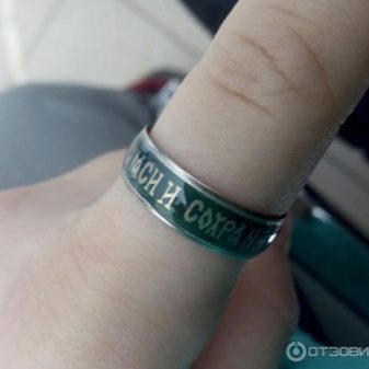 Se l'anello è percepito non solo come un elemento decorativo, ma come un "scacciare" i problemi, è meglio scegliere l'iscrizione esterna "Salva e conserva". E se vuoi indicare il tuo atteggiamento nei confronti della fede ortodossa, dovresti comprare un anello con inciso all'interno... Entrambe le opzioni sono vendute nella maggior parte delle gioiellerie, ma l'anello deve essere consacrato in chiesa.