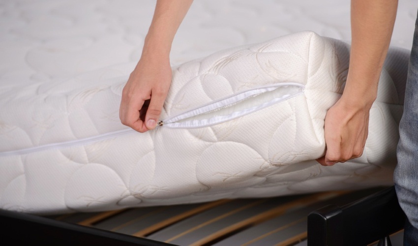 - Con una cerniera. All'interno di tali rivestimenti sfoderabili c'è direttamente il "riempimento" del materasso, quindi una persona può verificare immediatamente che tipo di riempimento è presente al suo interno. Questa fodera copre il materasso da tutti i lati, lo protegge da polvere e sporco.