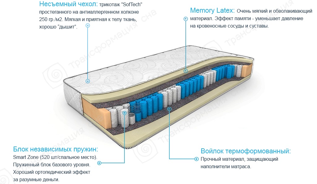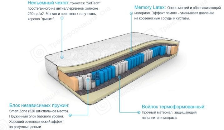 - Zona intelligente del sonno Dreamline. La combinazione di un'unità a molla indipendente e uno strato di schiuma di lattice a sette zone fornisce un pronunciato effetto massaggio, crea un ambiente confortevole per il sonno e il relax. Il materasso è fornito in una fodera in maglia. Progettata per un carico fino a 150 kg per seduta, è caratterizzata da un grado di rigidità medio, si presenta in un'ampia gamma di taglie.