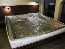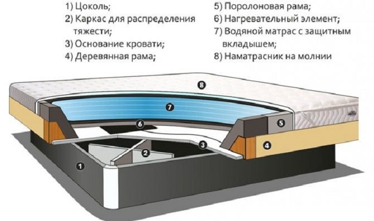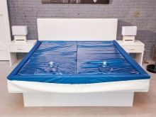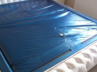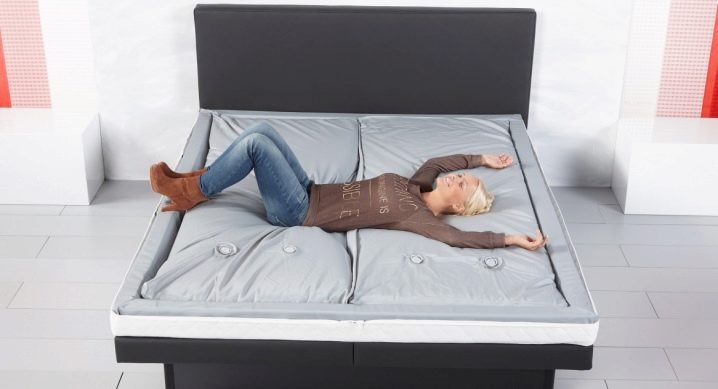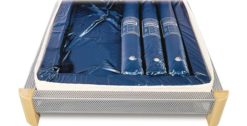 L'essenza del design è una copertura resistente all'acqua riempita con acqua o altro liquido con additivi speciali. Guaina in tessuto - PVC elastico. Riposare su una superficie del genere è in qualche modo simile all'ondeggiare sulle onde, ma esiste una tecnologia con l'uso di fibre stabilizzanti che smorzano le vibrazioni dell'acqua. Il materasso ad acqua ha un peso piuttosto imponente, in considerazione di ciò, poggia su uno speciale reticolo di base cruciforme, che distribuisce uniformemente la massa della struttura.