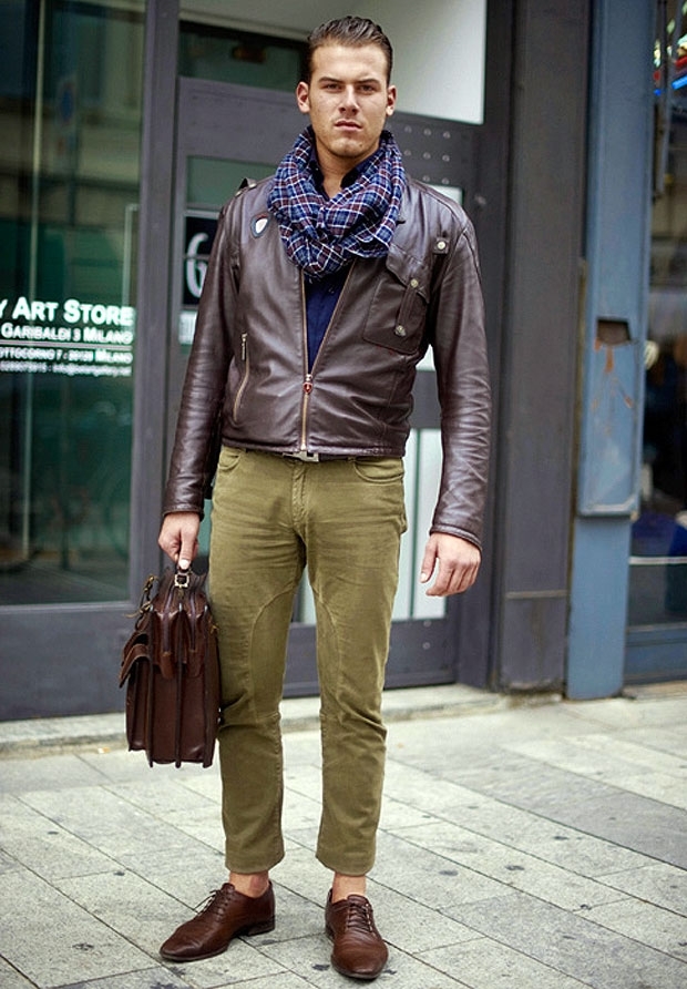 In questo caso, la giacca di pelle dovrebbe differire dal colore dei capelli dell'uomo. Puoi aggiungere un tocco di contrasto con una sciarpa.
