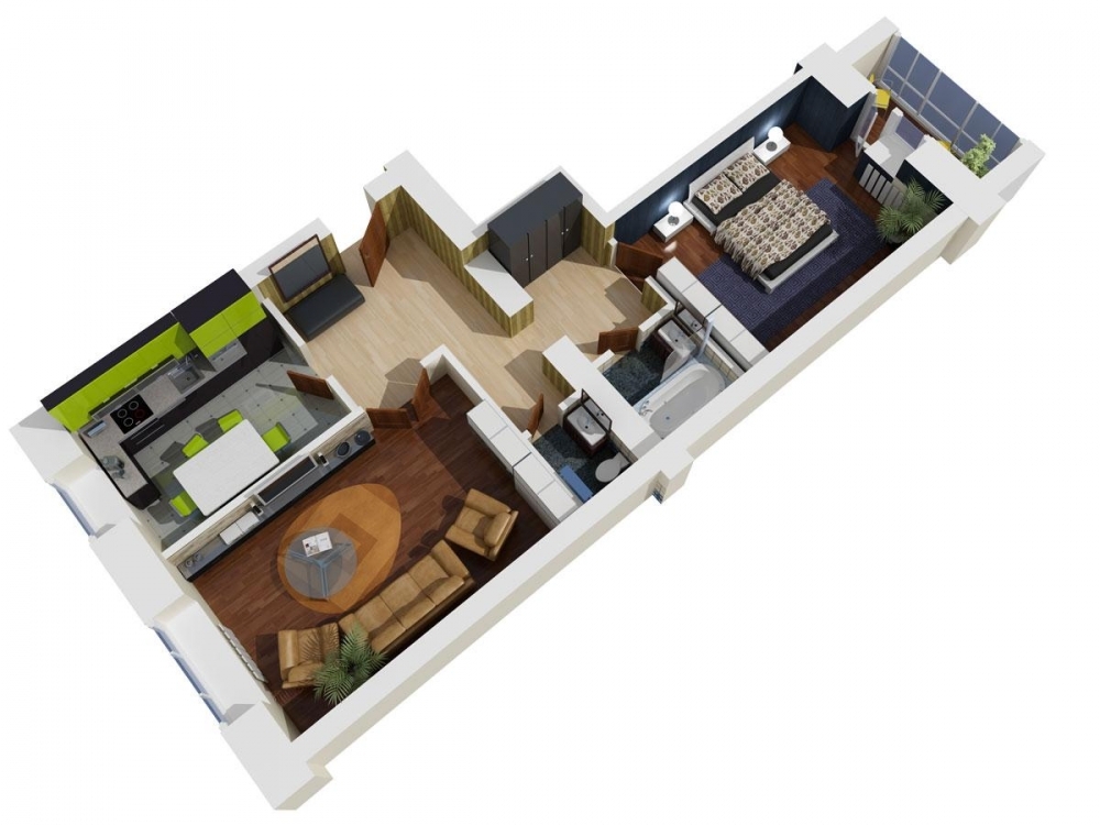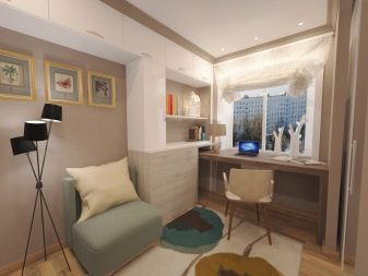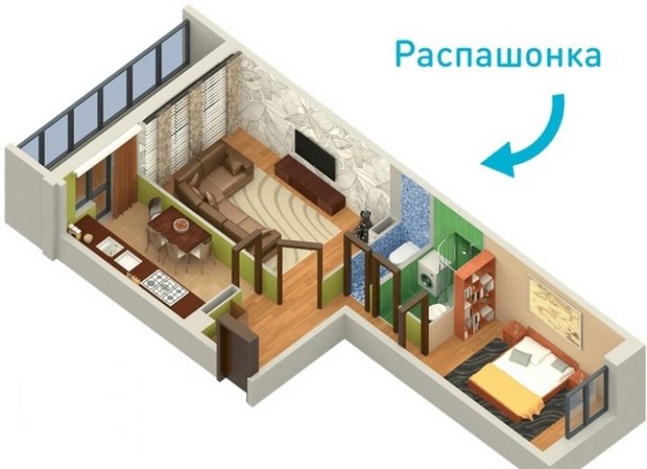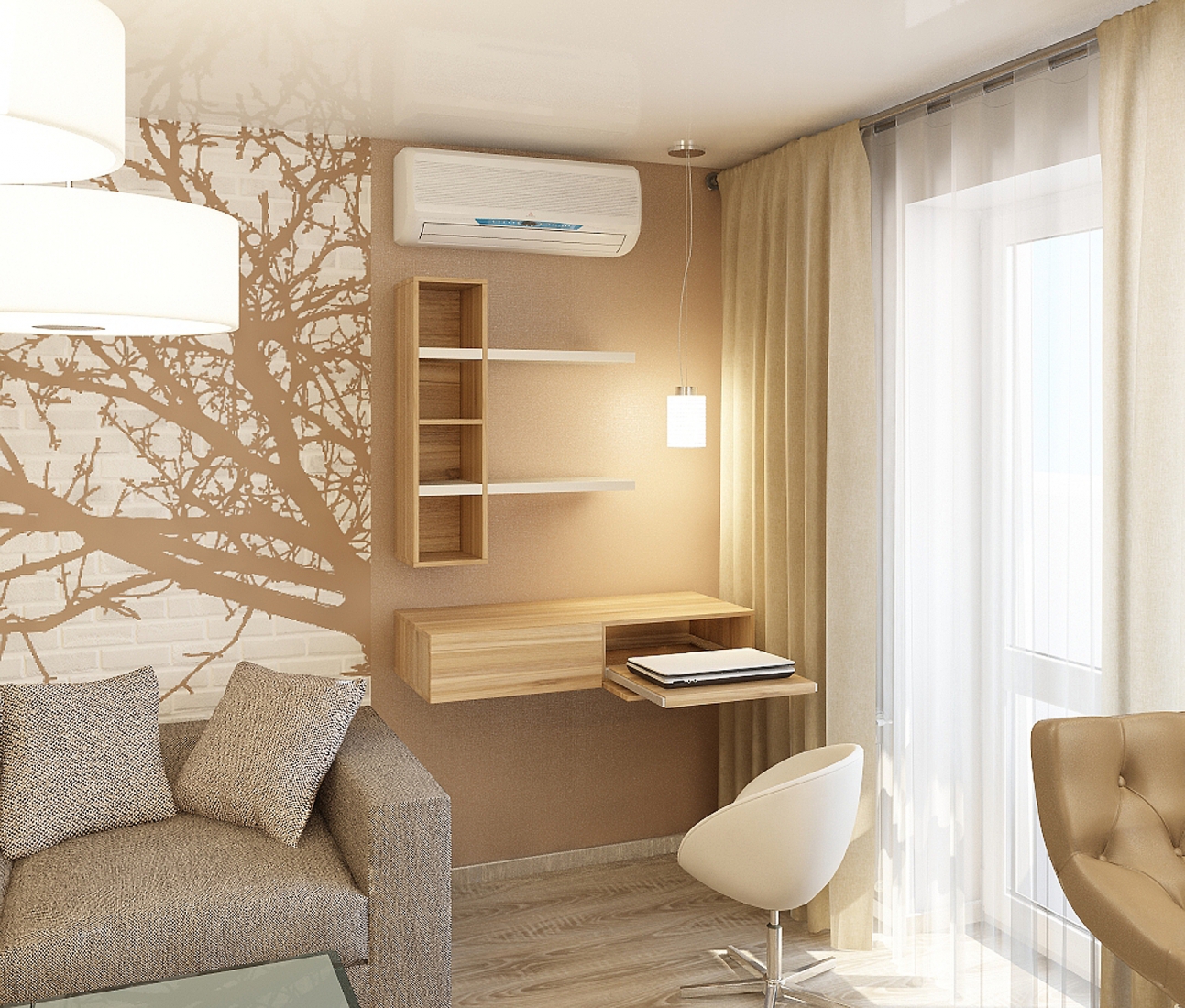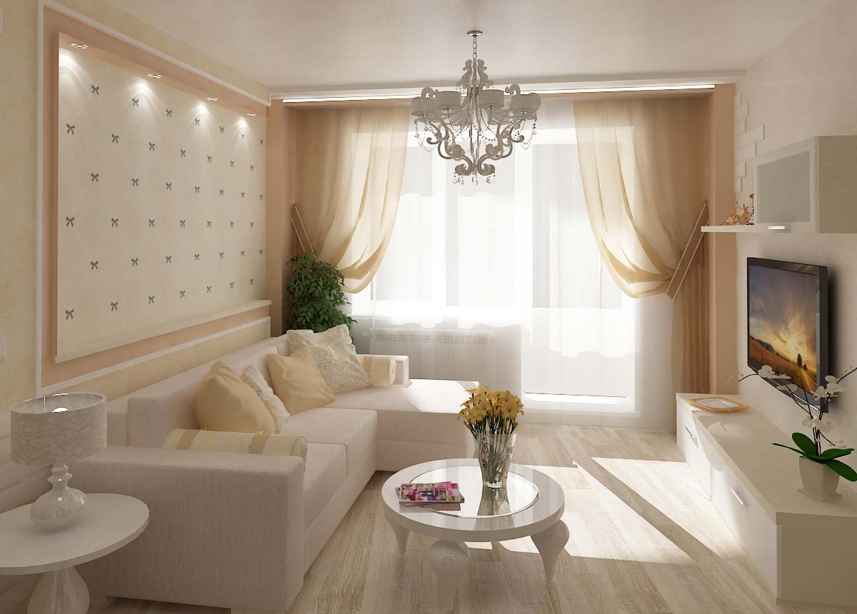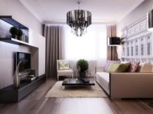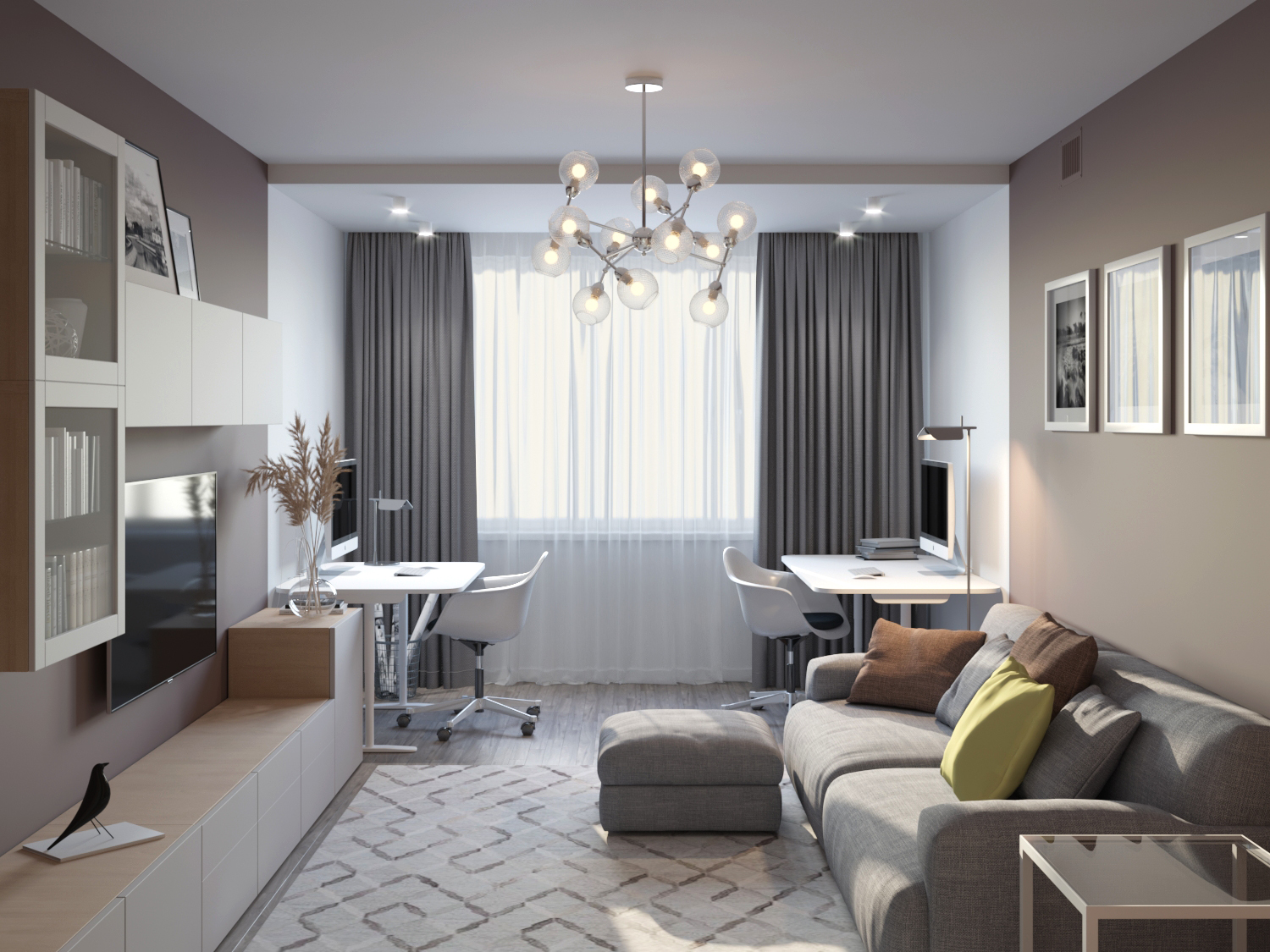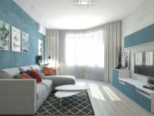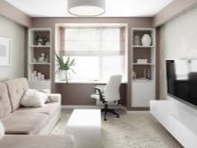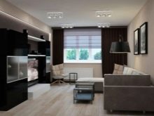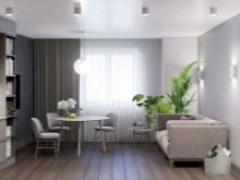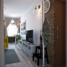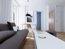 La camera da letto e il soggiorno sono separati da porte. Dal corridoio si accede alla sala. Il centro del soggiorno è occupato da un divano, una poltrona, un tavolino. Il posto di lavoro può essere posizionato sia nel soggiorno che nell'area ricreativa, l'importante è posizionarlo nell'angolo di una qualsiasi delle stanze.