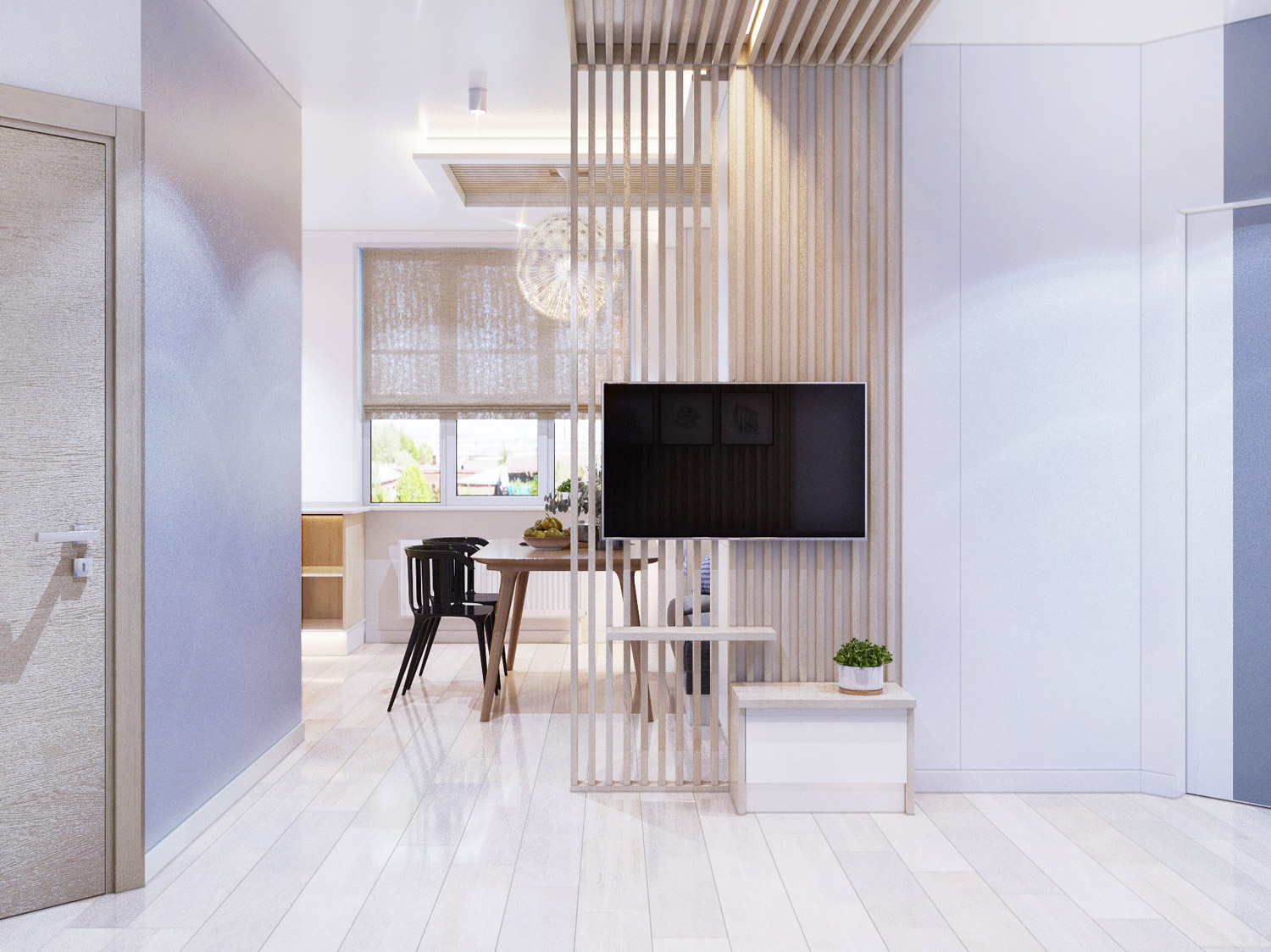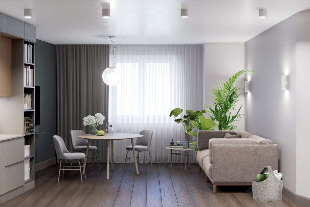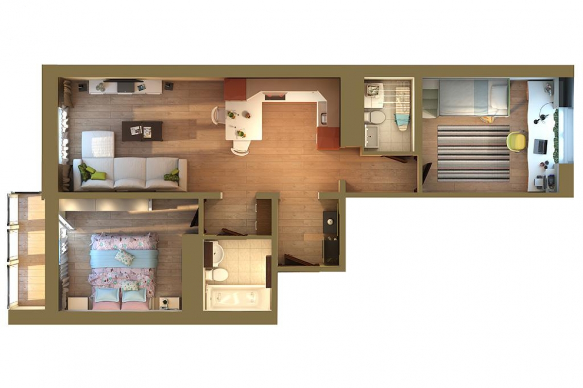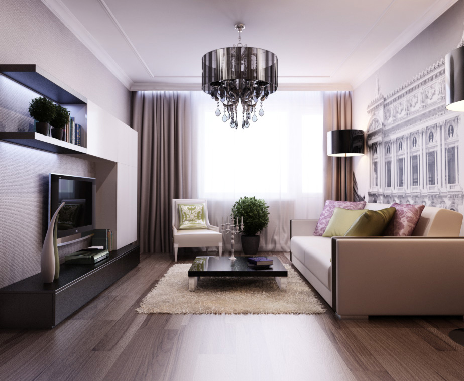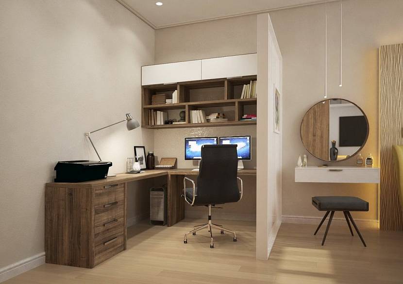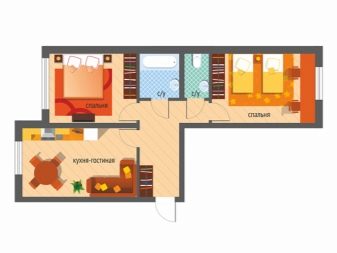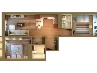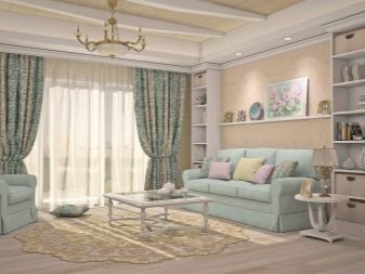 La camera da letto e il soggiorno sono separati da porte. Dal corridoio si accede alla sala. Il centro del soggiorno è occupato da un divano, una poltrona, un tavolino. Il posto di lavoro può essere posizionato sia nel soggiorno che nell'area ricreativa, l'importante è posizionarlo nell'angolo di una qualsiasi delle stanze.