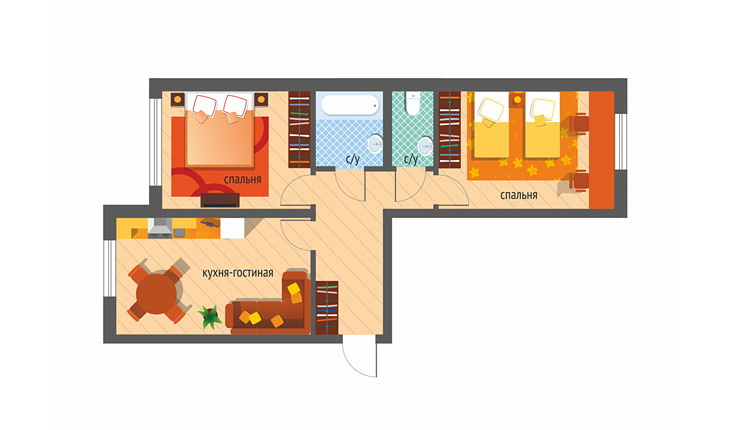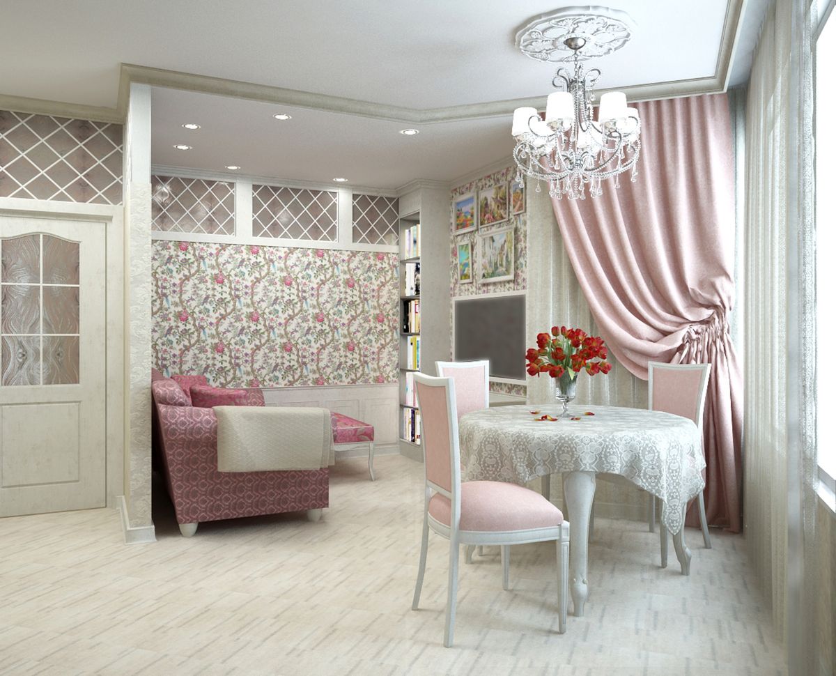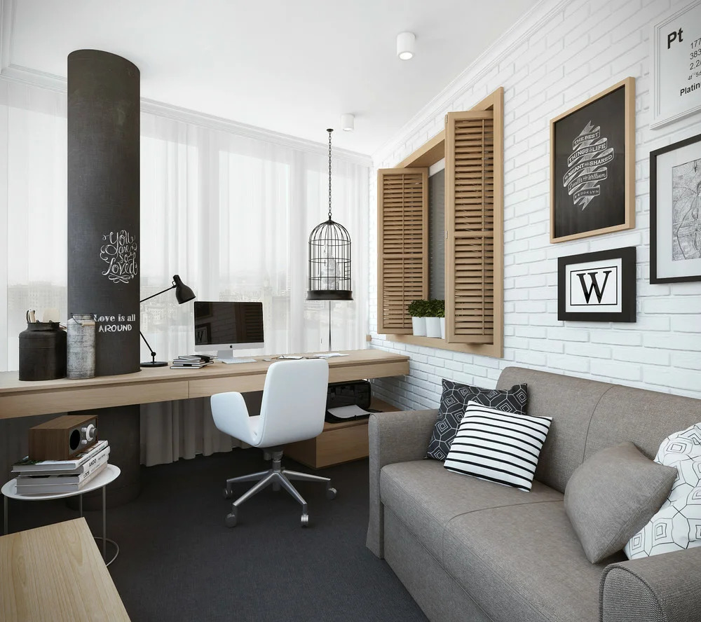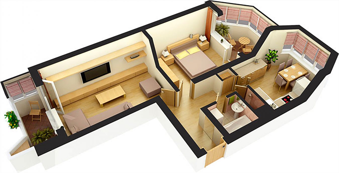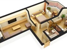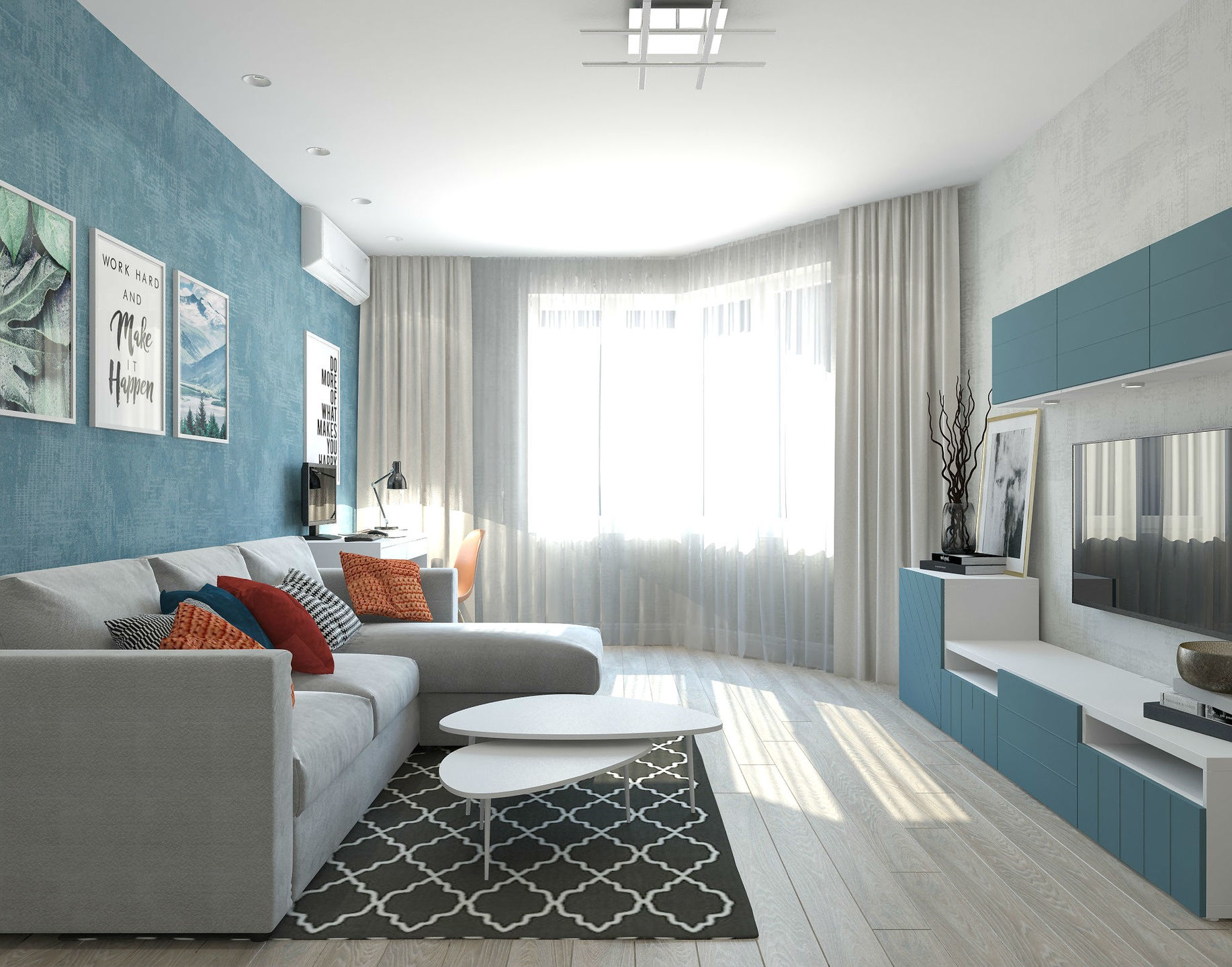 La camera da letto e il soggiorno sono separati da porte. Dal corridoio si accede alla sala. Il centro del soggiorno è occupato da un divano, una poltrona, un tavolino. Il posto di lavoro può essere posizionato sia nel soggiorno che nell'area ricreativa, l'importante è posizionarlo nell'angolo di una qualsiasi delle stanze.