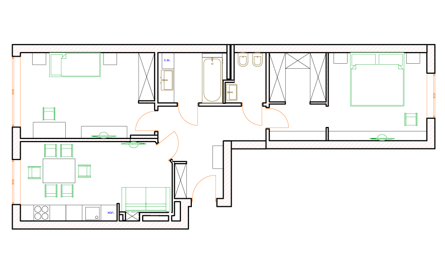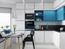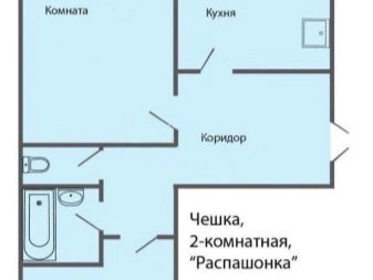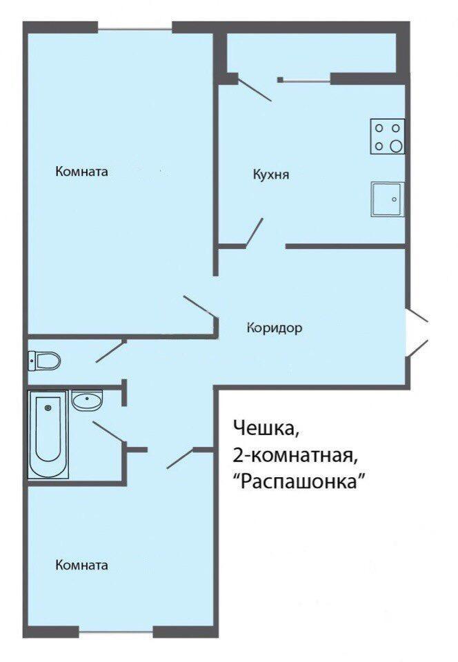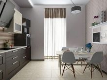 Le particolarità di questa disposizione sono che la zona cucina occupa la maggior parte dello spazio o almeno 1/3 dello spazio abitativo. Il corridoio finisce con esso. Già dalla cucina ti ritrovi in altre stanze. Il bagno è attaccato alla cucina, per comodità di solito è combinato.