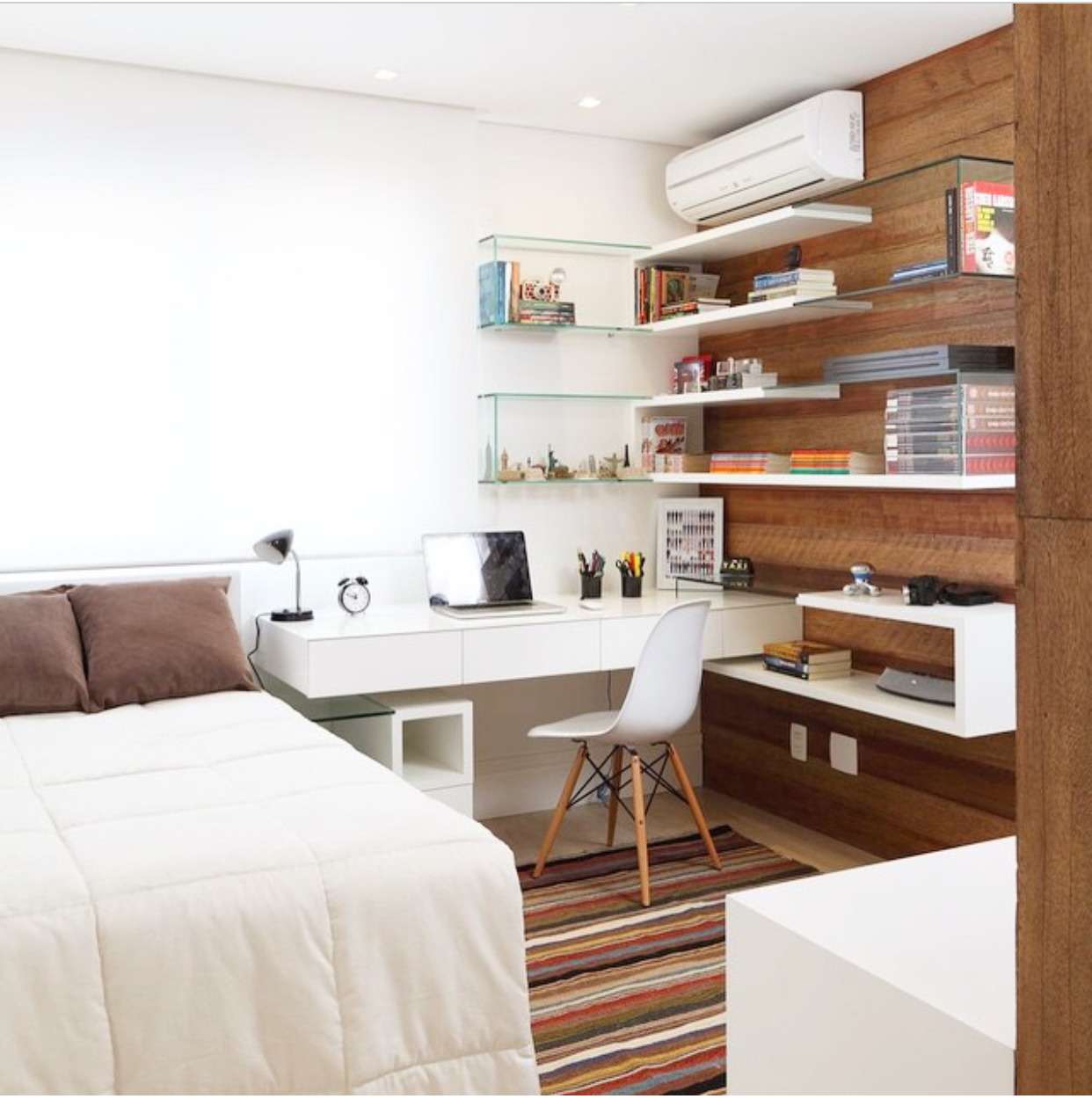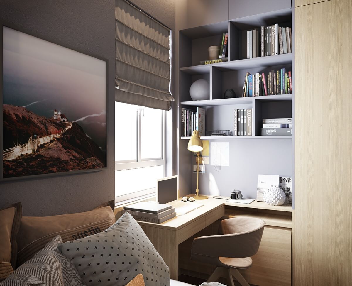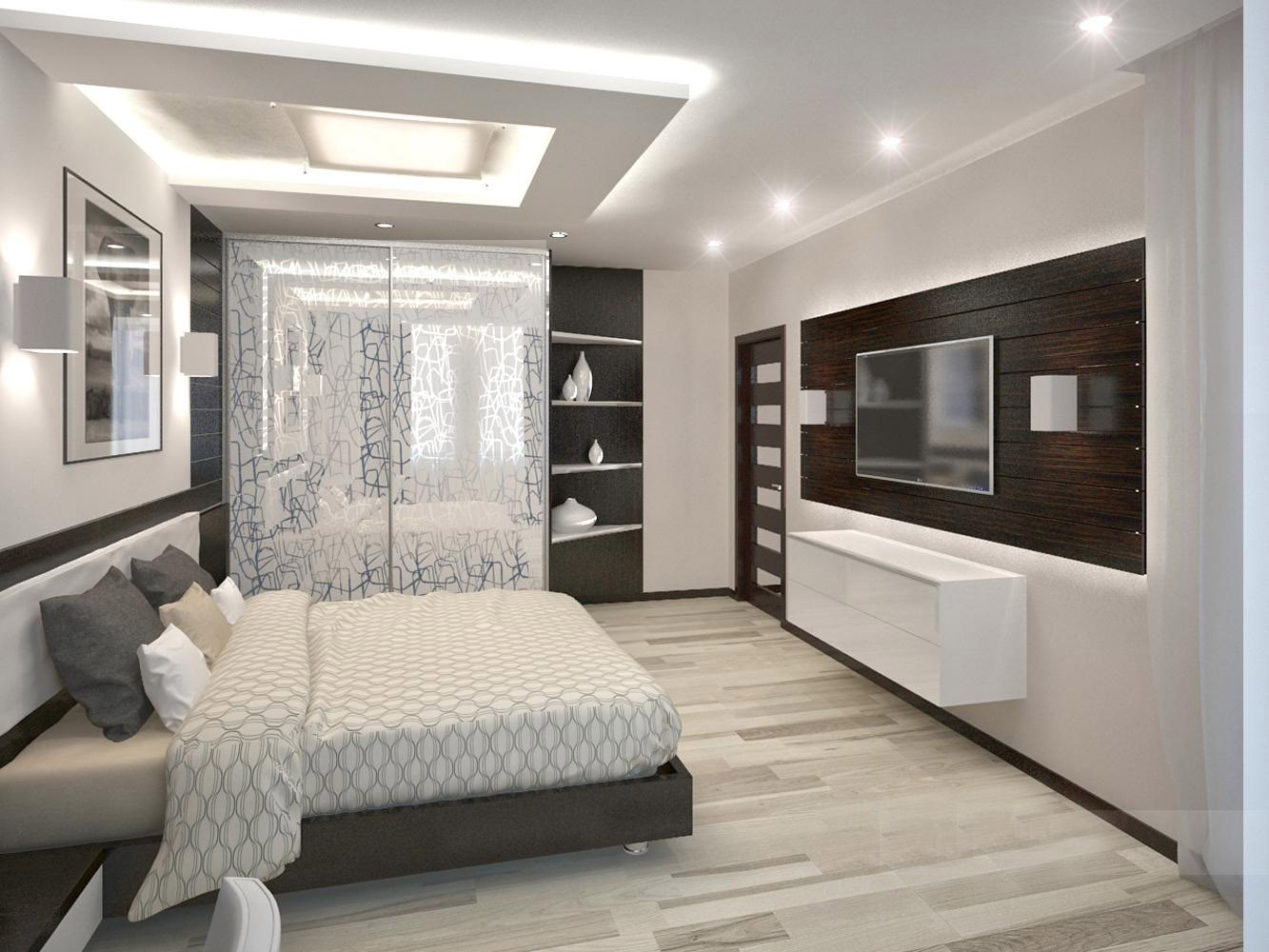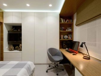 In questa opzione, molto dipende dai desideri personali di ciascuno degli inquilini. Non c'è soggiorno qui, molto probabilmente diventerà la stanza dei genitori. Ci sarà anche una TV, una libreria, vari scaffali e una postazione con computer per uno o entrambi i coniugi.