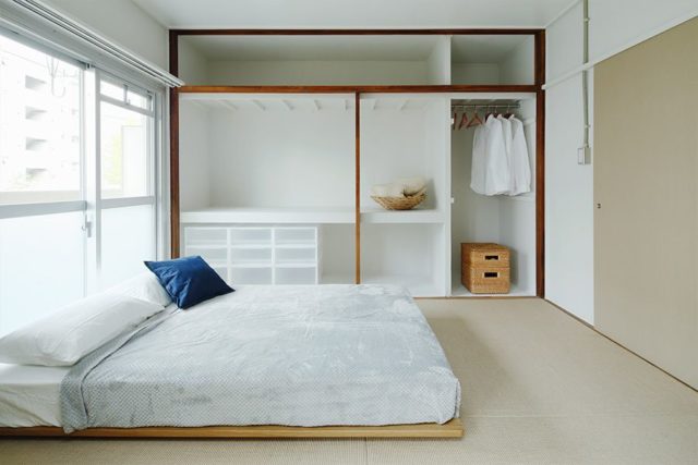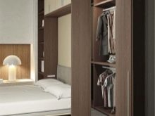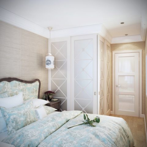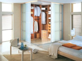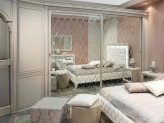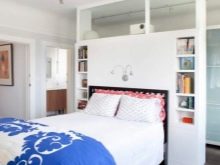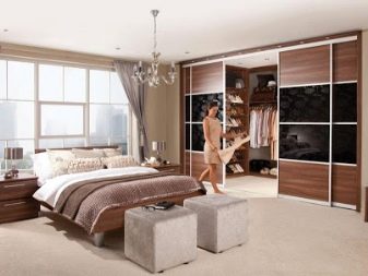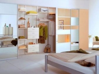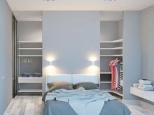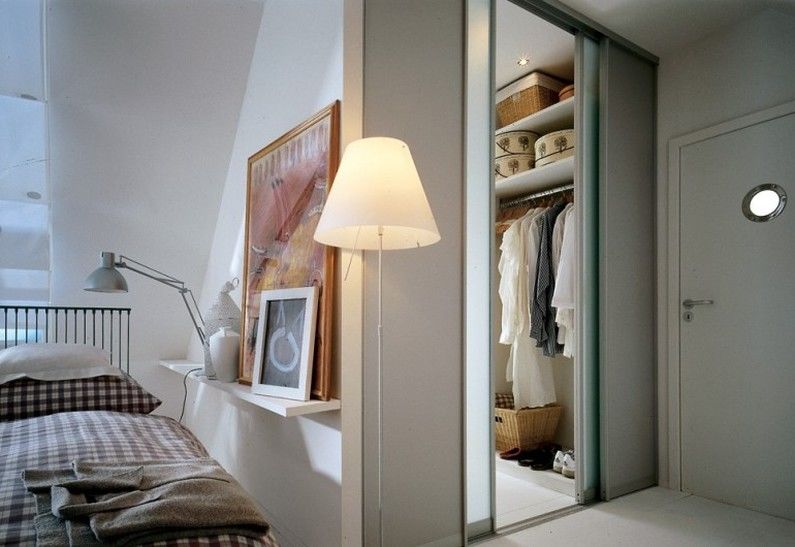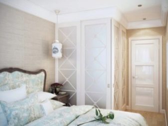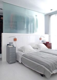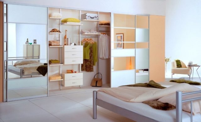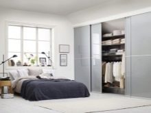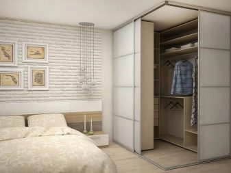 Una buona opzione è posizionare uno spogliatoio a figura intera dietro il letto. Allo stesso tempo, il sistema di scorrimento ti consentirà di sistemarlo in modo tale che assomigli a un normale muro, ma allo stesso tempo tutto ciò di cui hai bisogno si troverà all'interno.