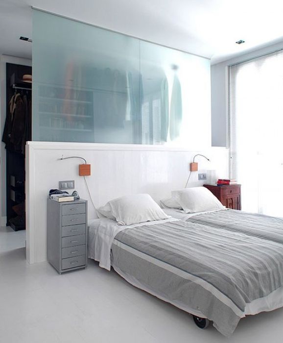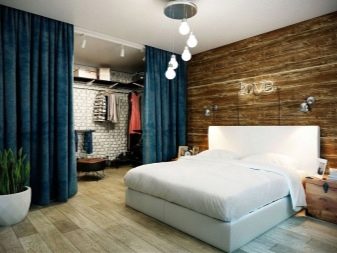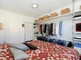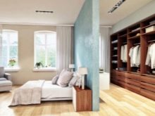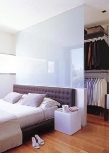 Poiché nella camera da letto non è consentito l'accumulo di mobili, non sarà necessario suddividere lo spazio con il suo aiuto.... Inoltre, se è concepito per attrezzare uno spogliatoio, non ci sarà sicuramente un armadio nella camera da letto. Cioè, dovrebbe creare una zona separata inventando una recinzione per essa. Questo sarà lo spogliatoio.