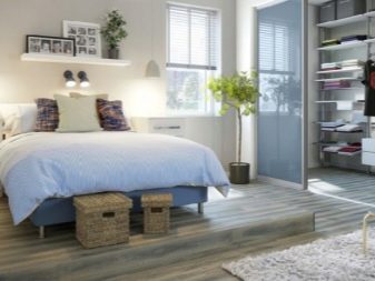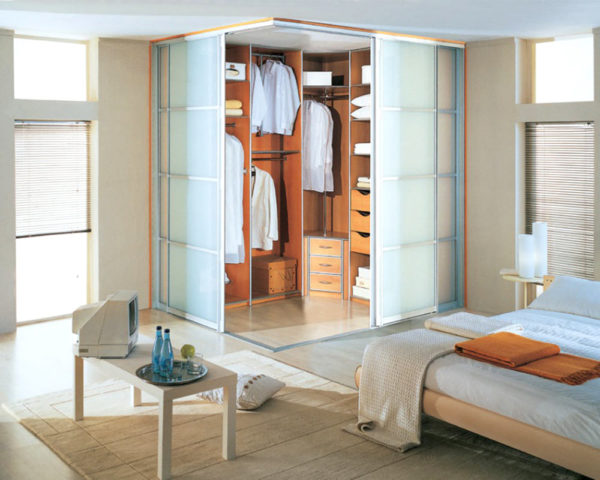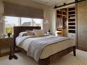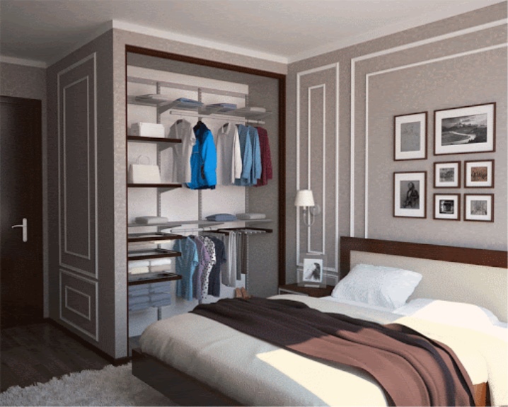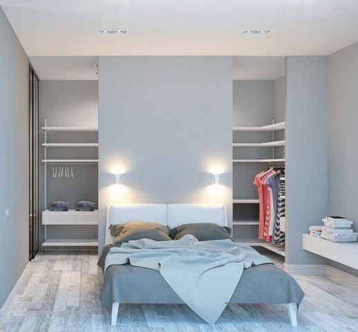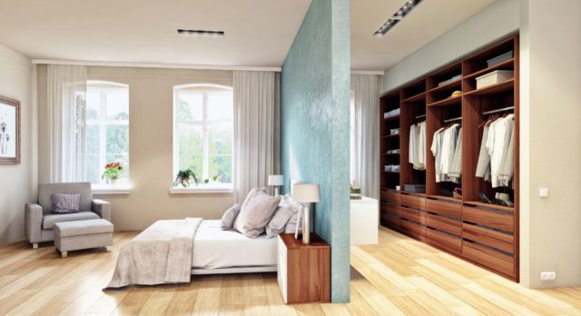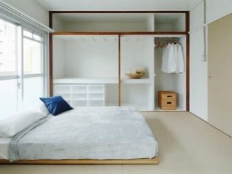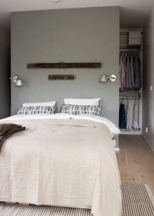 In assenza di tali elementi, vale la pena considerare l'opzione in cui ci sarà un letto in una parte della camera da letto e uno spogliatoio nell'altra.