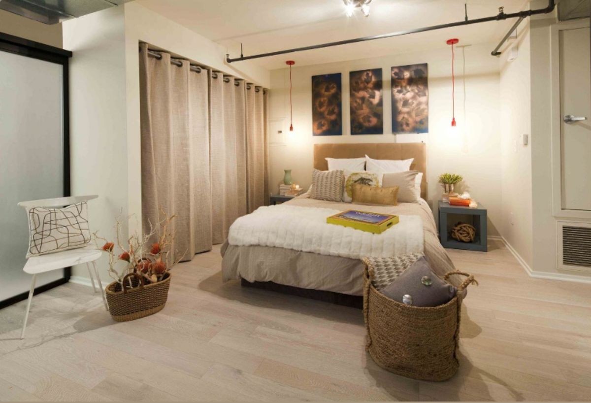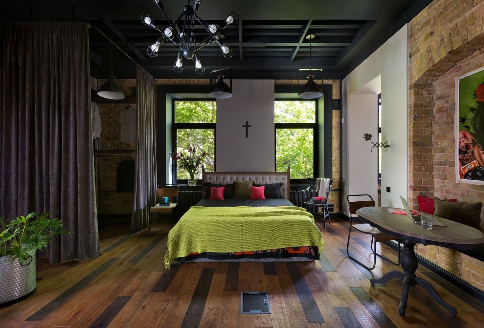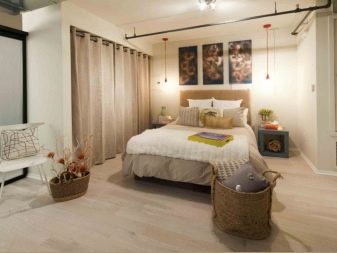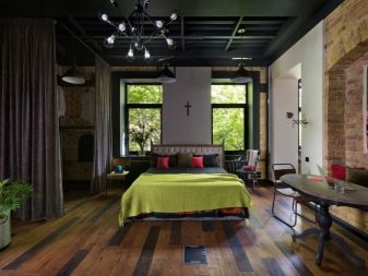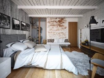 Nella camera da letto basterà mettere un letto senza fronzoli, ampie finestre, travi al soffitto con lampade originali completeranno la composizione complessiva. Le pareti possono essere decorate sia con mattoni che in pietra. La cabina armadio può essere facilmente nascosta con tende abbinate. Se l'area della stanza è grande, qui potrebbe trovarsi una vasca da bagno sul podio dietro una parete divisoria in mattoni.