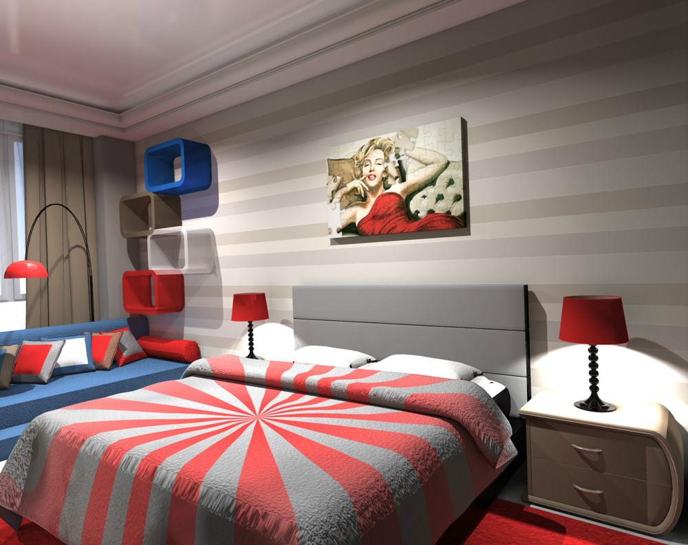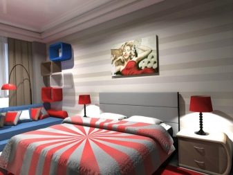 Non tutti possono resistere a un tale tripudio di colori, soprattutto in camera da letto. Ma per i giovani, così come per le nature creative, questa opzione sarà accettabile. Poster colorati con stelle, a volte su tutta la parete, un letto insolito, poltrone a forma di spugna, tessuti luminosi, scaffali colorati: tutto questo potrebbe benissimo coesistere in una stanza. E c'è un posto per uno spogliatoio. Forse si troverà dietro una porta rossa o gialla.