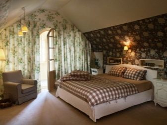 Ognuno vede questo stile a modo suo, ha diverse opzioni per l'incarnazione. Ma la cosa principale è che l'atmosfera generale è trasportata nel passato. Un semplice letto in legno con un tappeto a scacchi, una cassettiera in legno con mazzi di fiori, tende semplici, lampade: questo è ciò che creerà l'atmosfera generale. Anche i pavimenti in legno e le travi sul soffitto funzionerebbero in questo stile. Anche qui è ammessa la presenza di mobili intagliati o in vimini.