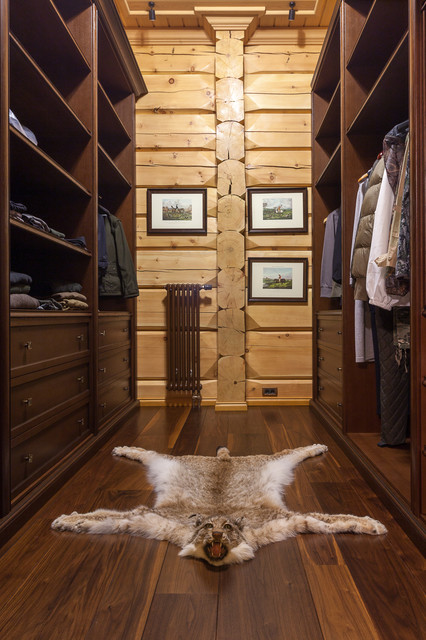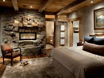 Dovrebbe esserci una netta predominanza di superfici in legno, pietra e mattoni che possono diluire il quadro generale. Spesso un camino trova il suo posto in tali camere da letto. Il pavimento può essere ricoperto da un soffice tappeto dai colori molto pacati, che ricorda la pelle di un animale. L'arredamento ha forme laconiche e dovrebbe anche sembrare un po' grezzo.