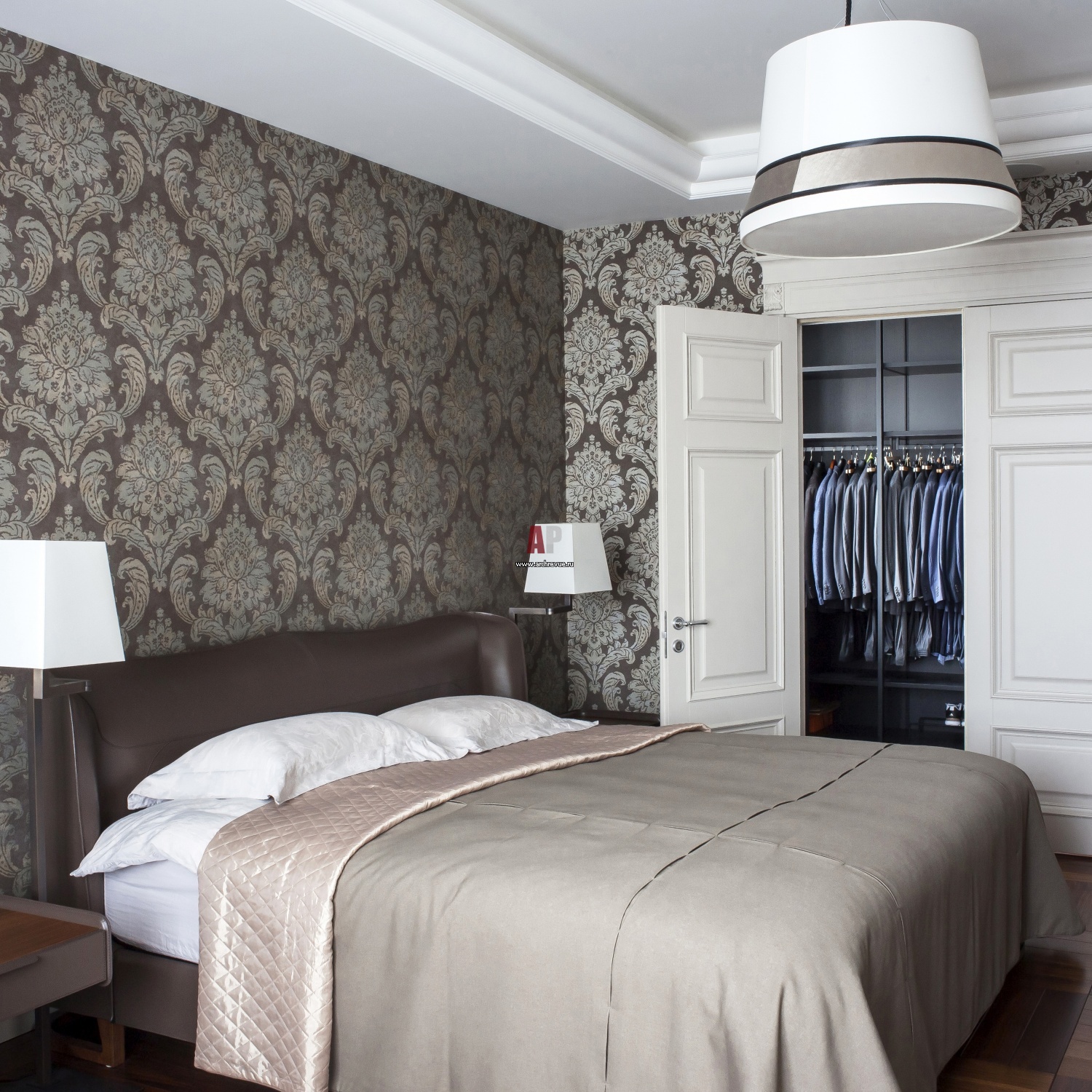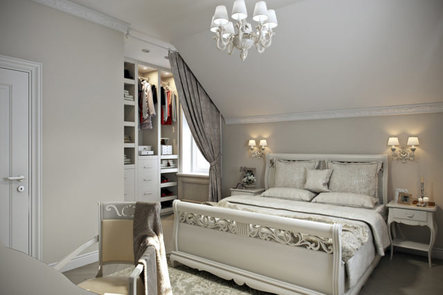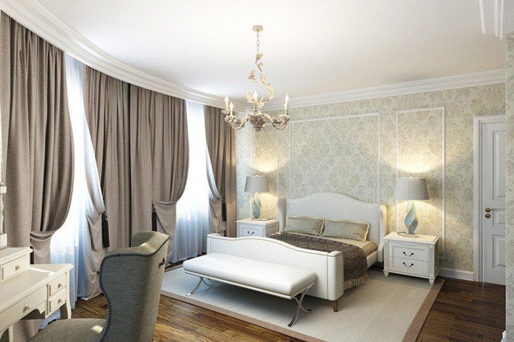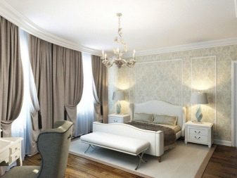 Ma il neoclassicismo sarà più sobrio e severo. Superfici in legno e pelle, un minimo di decoro. Tutto sembra elegante, costoso, ma niente di superfluo. Tende: senza fronzoli, combinate con altre superfici nella tavolozza dei colori. In una camera da letto del genere, dietro una delle porte, puoi trovare un piccolo spogliatoio. Il design stesso consente colori come beige, marrone, grigio, bianco, nero. Possono essere diluiti con blu, lilla, verde chiaro. Ma un tripudio di colori e una lucentezza eccessiva non dovrebbero essere qui di sicuro.