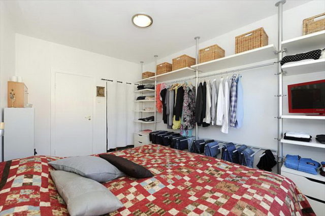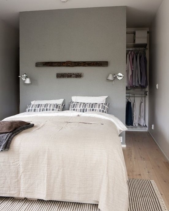 - Anche una cabina armadio dietro un tramezzo in legno è una soluzione intelligente. La camera da letto è abbastanza compatta, ma nel complesso la stanza sembra accogliente. La parete divisoria è stata progettata in modo tale che ci sia luce naturale sia nella camera da letto che nello spogliatoio.