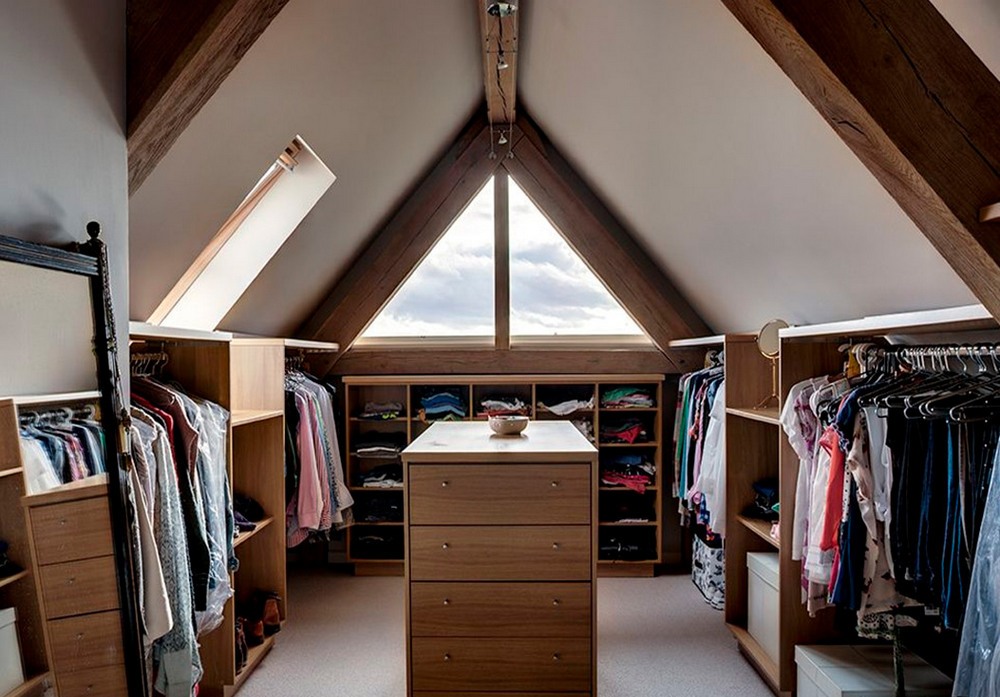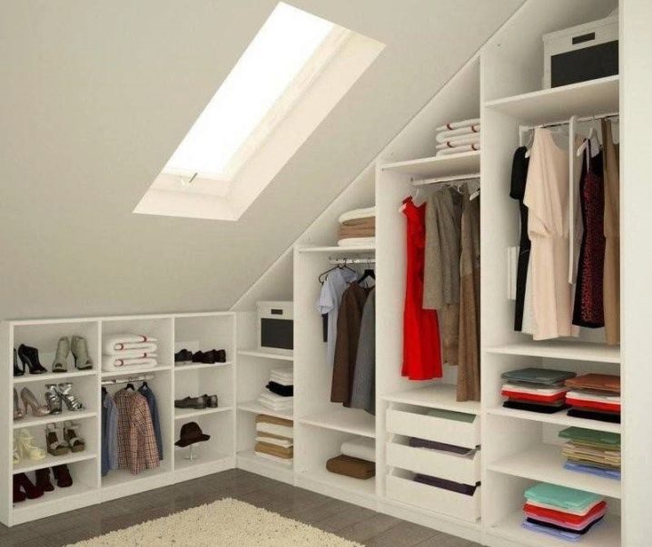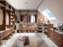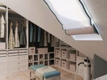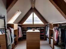 Ti consigliamo inoltre di prestare attenzione a un'idea eccellente e audace nella progettazione di un armadio: la sua disposizione sotto il tetto (in soffitta). Naturalmente, questa idea può essere realizzata solo vivendo in una casa privata o in una casa a schiera dove ci sono finestre sul tetto. Una stanza del genere risulta essere luminosa e confortevole per il soggiorno, puoi metterci tutto ciò di cui hai bisogno.