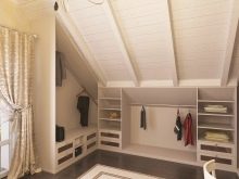 - Se lo spogliatoio sarà situato in soffitta, cioè sotto il tetto, allora qui probabilmente dovrai considerare una disposizione lineare lungo una parete, soprattutto se la stanza è di circa 3 mq. m.