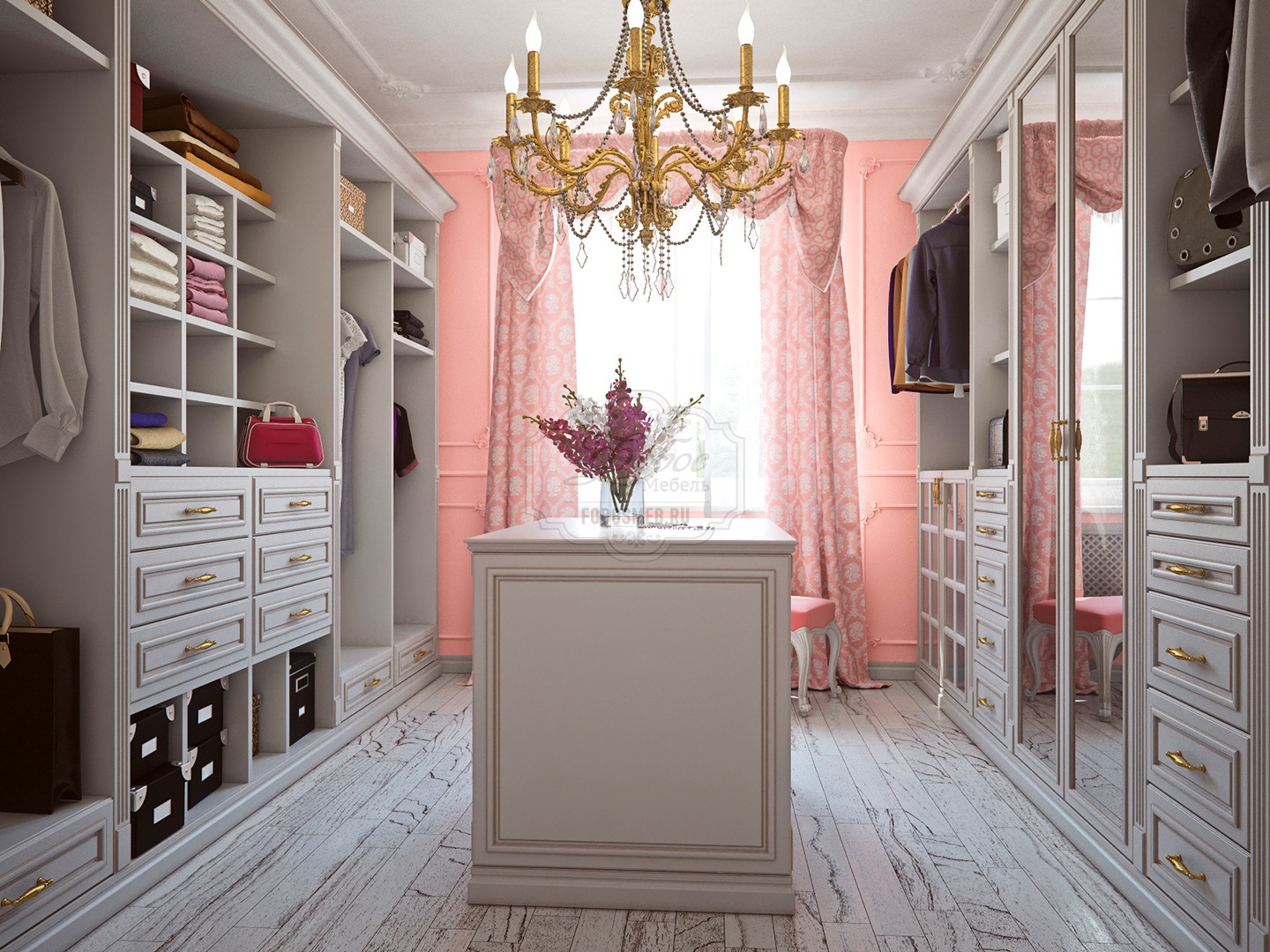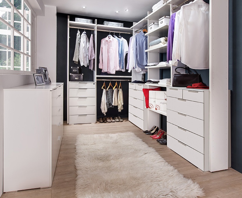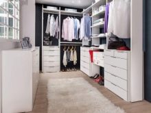 - Se l'area della stanza è di 8 o anche 10 mq. m., allora dovresti pensare a sviluppare un progetto per un camerino a forma di U. In una stanza così spaziosa con una finestra, puoi persino posizionare una piccola cassettiera ad isola al centro della stanza, dove sarà conveniente riporre varie piccole cose e accessori.