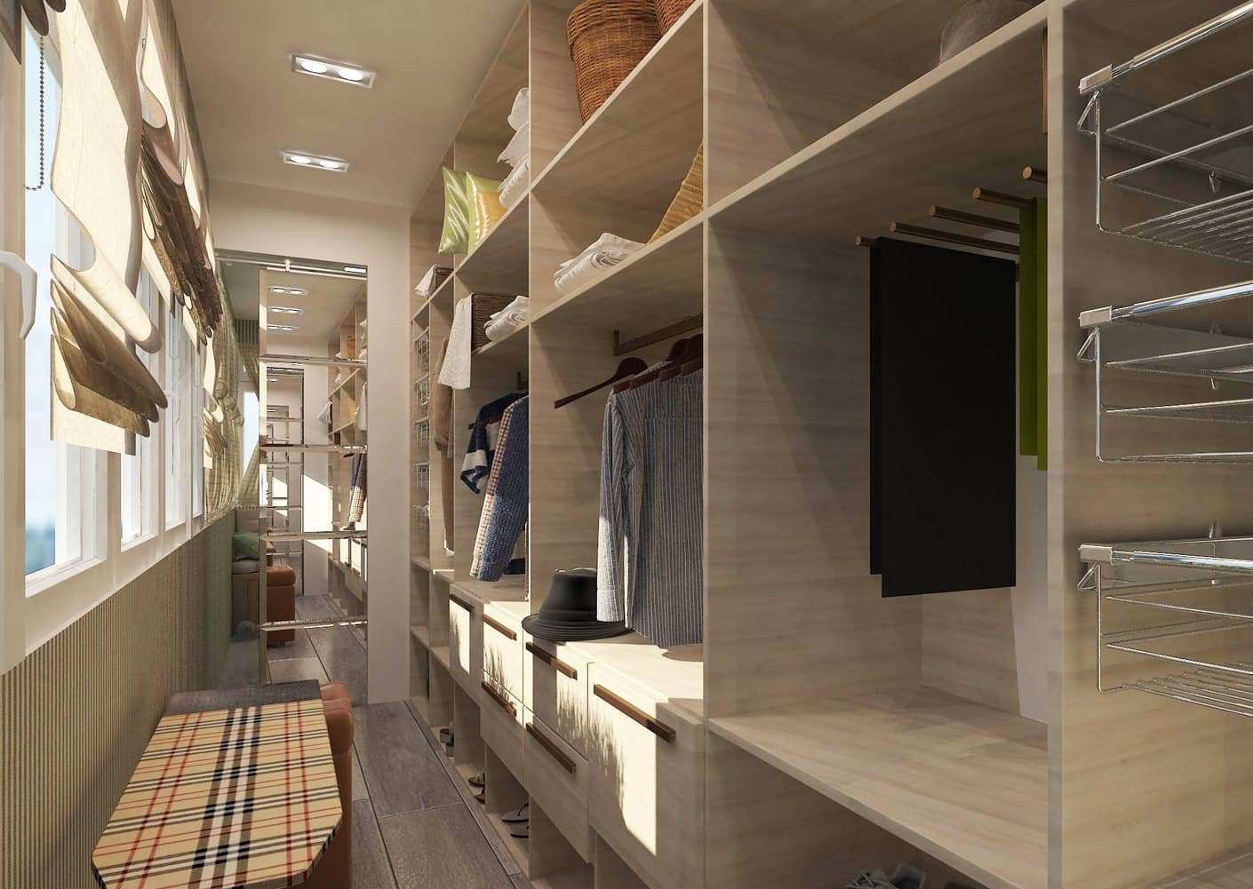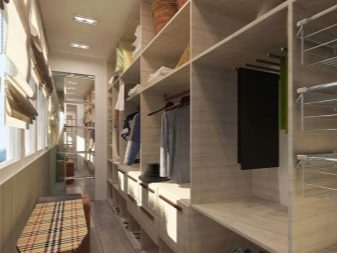 Ti consigliamo di prestare attenzione al design originale di un piccolo spogliatoio sul balcone in un design moderno. In un sistema di archiviazione ben scelto, c'è una retroilluminazione che può compensare la mancanza di luce al buio e c'è anche un comodo pouf.
