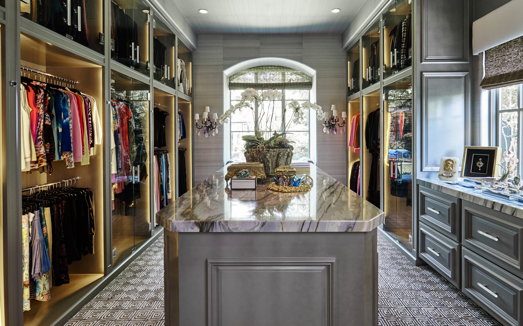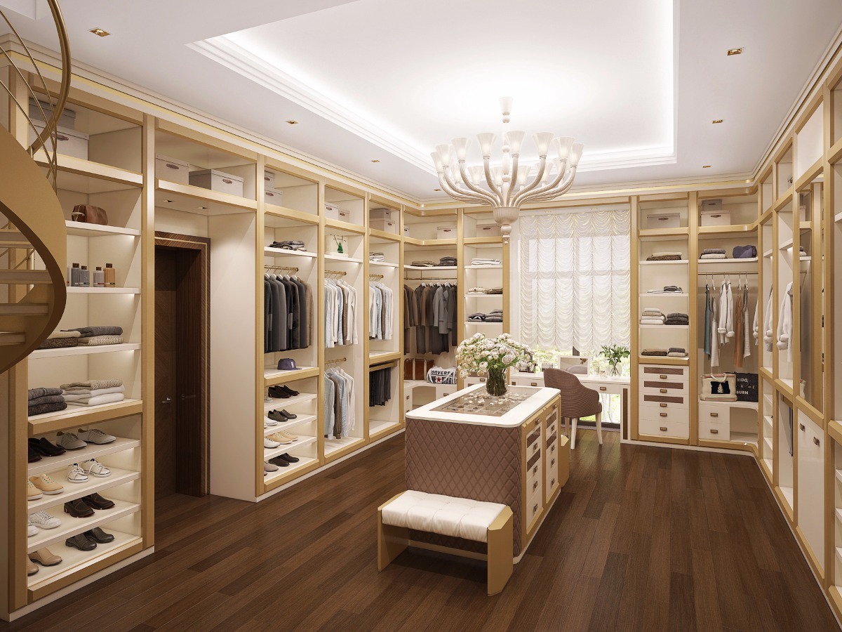 Lo spogliatoio sembra elegante nei toni del beige con mobili chiari e una piccola cassettiera nella parte centrale della stanza. Come accenti nella stanza, una grande finestra con tende francesi e un lussuoso lampadario.