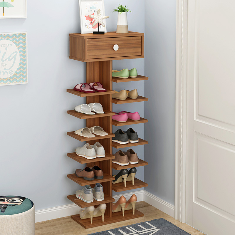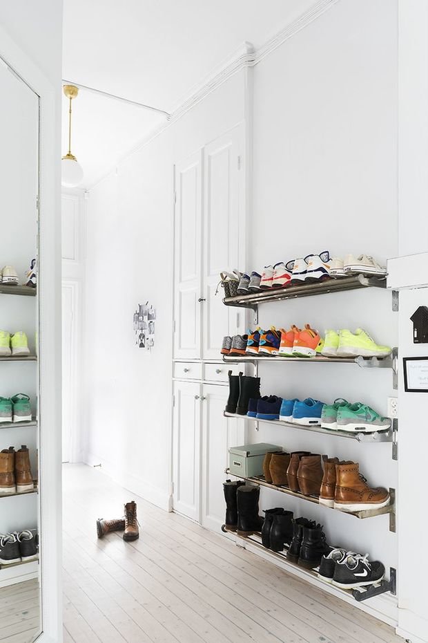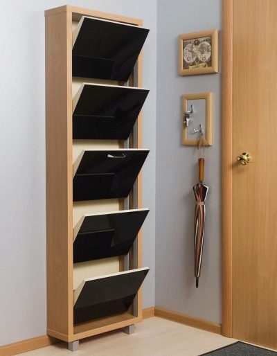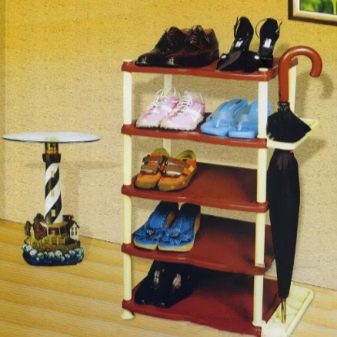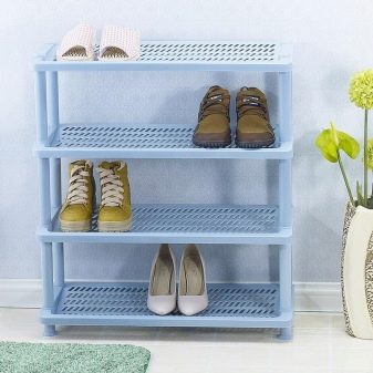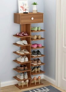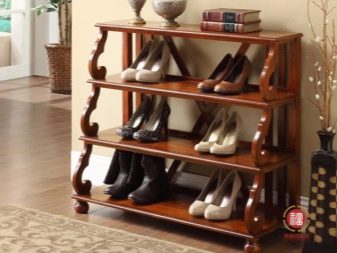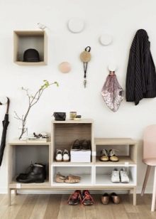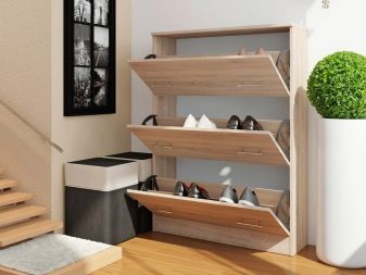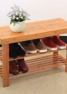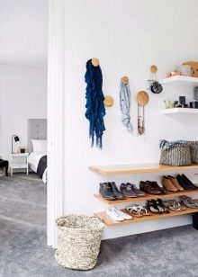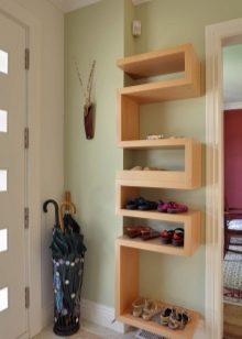Per le scarpe. Sono considerati il tipo più richiesto di prodotti per il corridoio. Tali scaffali sono solitamente installati vicino alla porta d'ingresso, dove i proprietari dell'appartamento e gli ospiti si tolgono le scarpe. Con il loro aiuto, sarà possibile non solo organizzare un comodo posizionamento delle scarpe, ma anche nasconderle se necessario. Se il corridoio è spazioso, puoi installare elementi aggiuntivi per riporre una collezione di scarpe e scarpe da ginnastica.