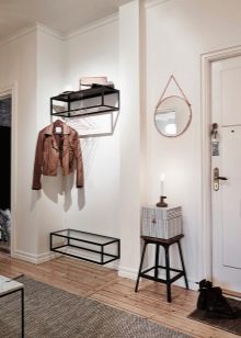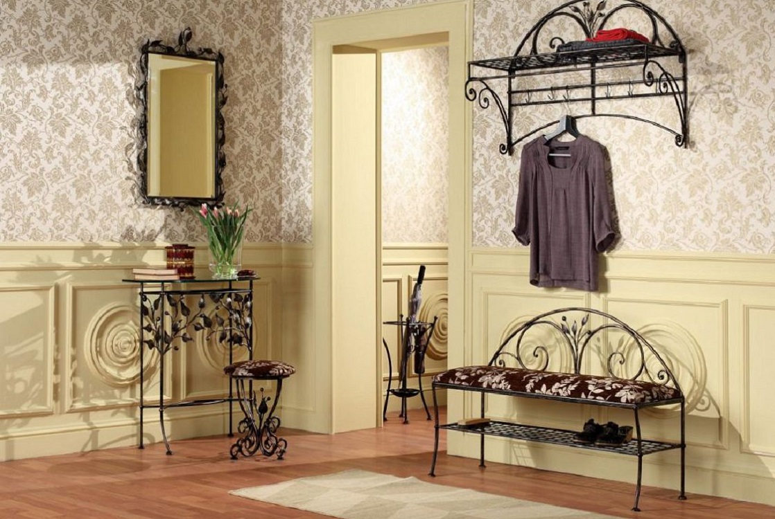 - Per il design classico è meglio scegliere mensole in ferro battuto in metallo, che renderanno il corridoio più elegante e austero allo stesso tempo. Puoi anche attrezzare una stanza in stile provenzale o country con tali prodotti.