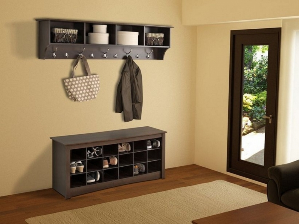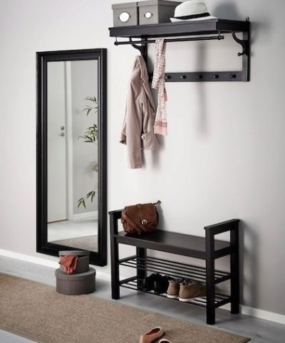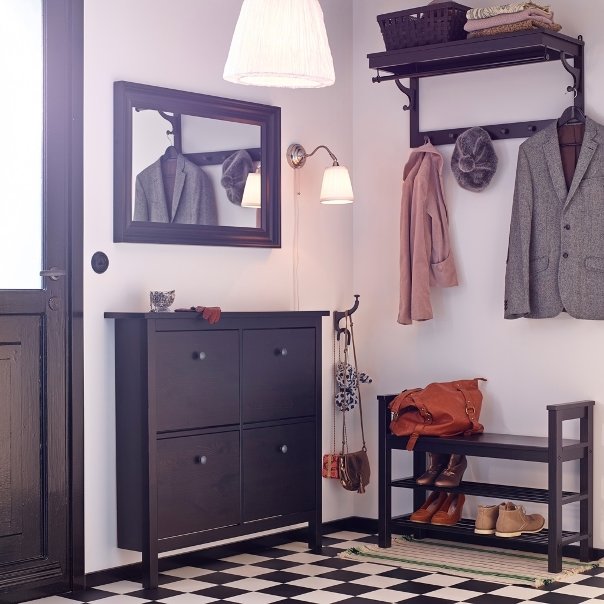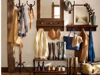 Infine, per chi non ama lo standard, è adatta l'opzione dell'originale scarpiera e appendiabiti in legno scuro. Si consiglia di installare tali strutture in un corridoio in stile moderno. Semplicità di esecuzione e originalità del design sono un connubio unico.