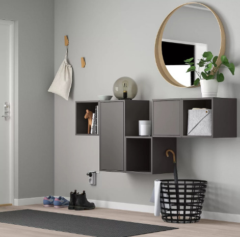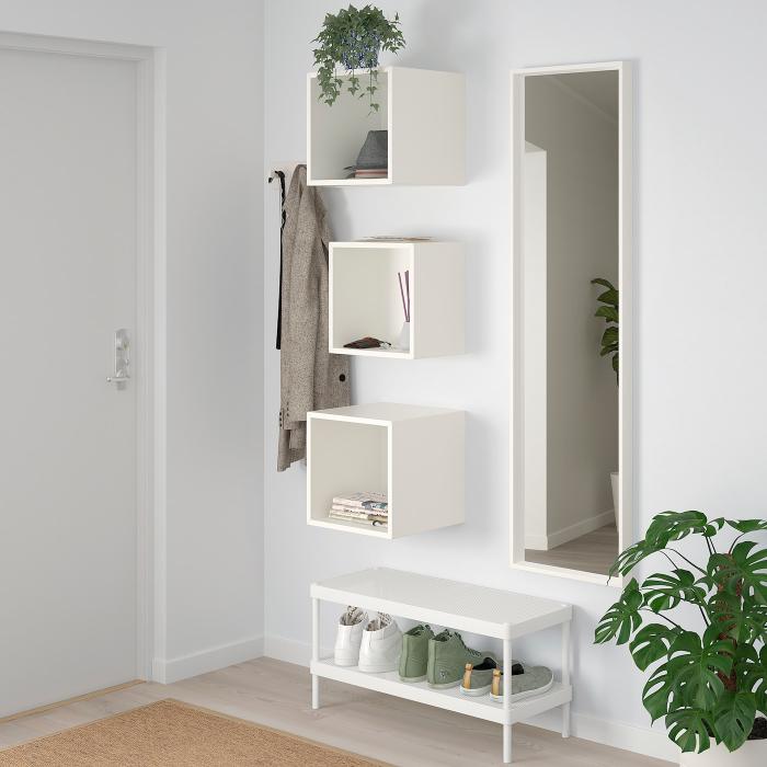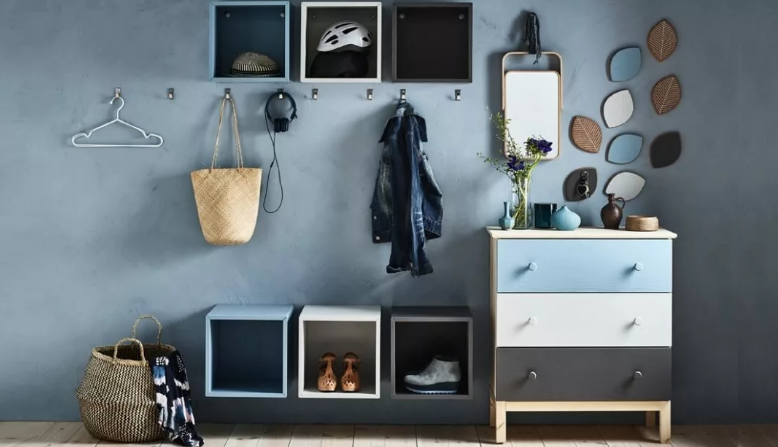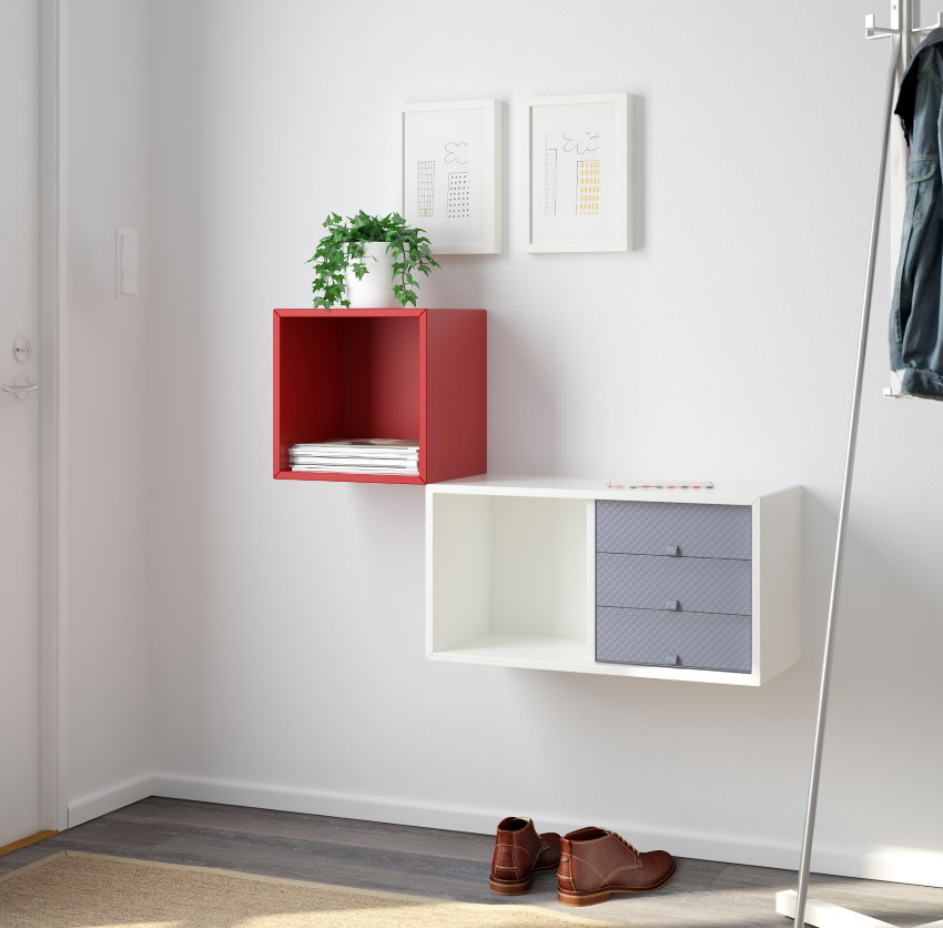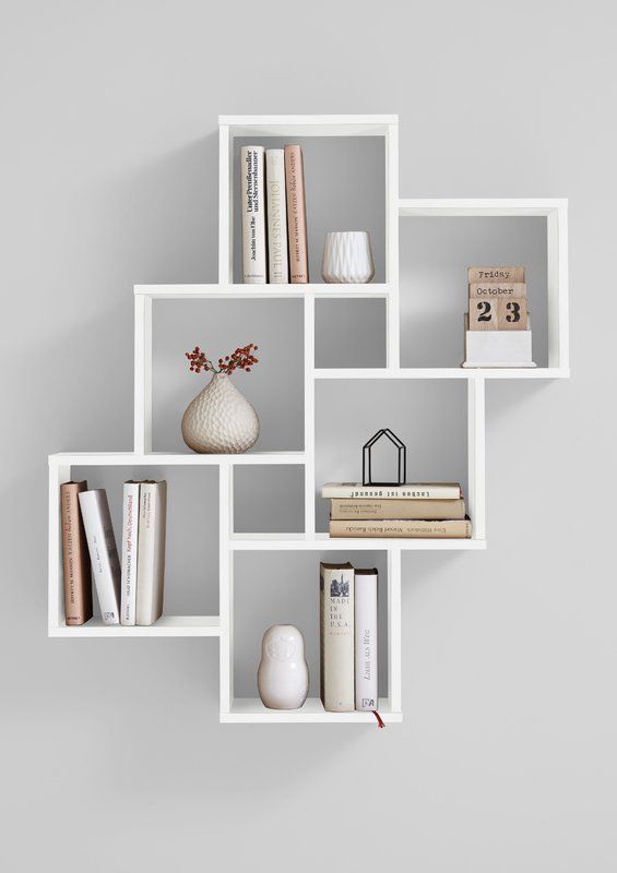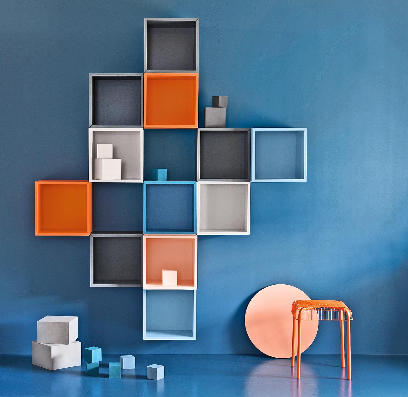 Un altro esempio è una serie di ripiani quadrati che si inseriscono perfettamente nello spazio e forniscono un comodo sistema di archiviazione. La combinazione di colori dei prodotti si sposa bene con l'interno della stanza.