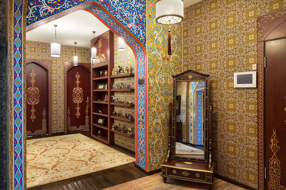 - Stile orientale può essere integrato con ripiani in legno scuro marrone, la cui superficie è decorata con un motivo o intagli non standard.