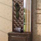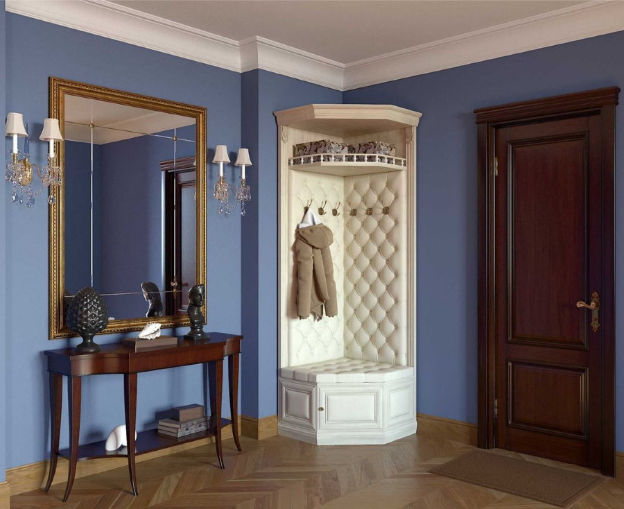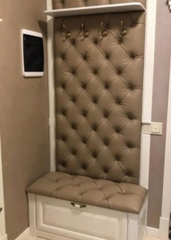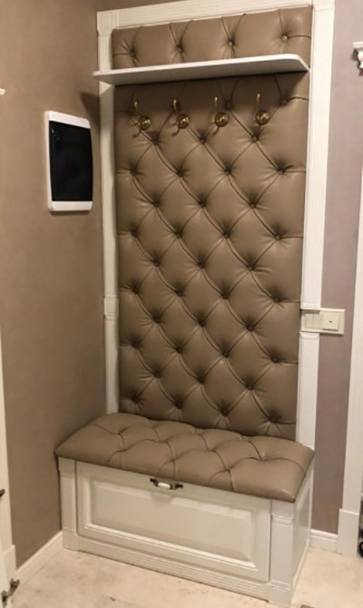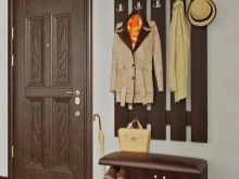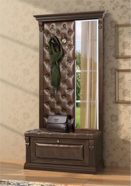 - Una robusta costruzione in legno scuro naturale, completata da un rivestimento in pelle marrone scuro con una cravatta da carrozza, apparirà armoniosamente nel corridoio, progettato in colori pastello.