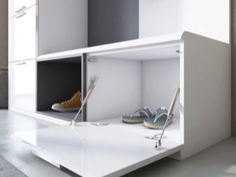 - Le scarpiere in tali design sono spesso integrate da un comodo sedile. Su di esso, le famiglie possono riposare un po' dalla strada. Cambiare le scarpe stando seduti su una scarpiera è molto più comodo e facile.