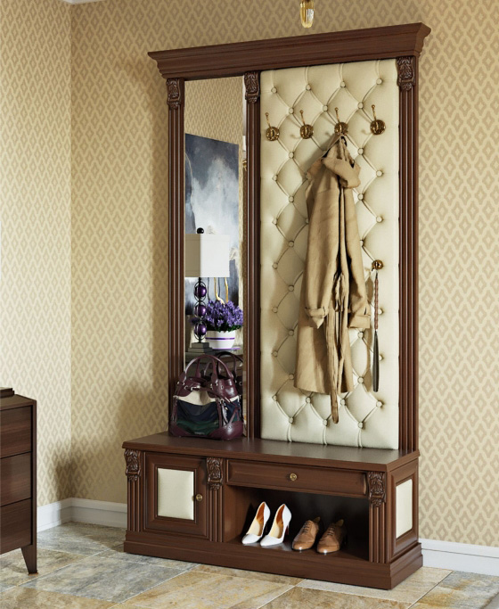 - Un appendiabiti alto combinato con una scarpiera sembrerà molto originale e costoso in un corridoio con un pavimento chiaro e pareti color caffè pallido. La struttura del mobile mostrata è rivestita in pelle nei colori bianco e cioccolato, ed è completata da un supporto per il carrello e da un inserto a specchio a figura intera.