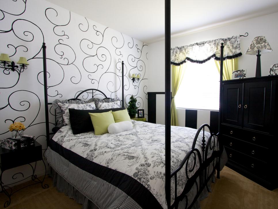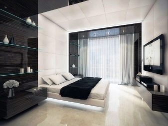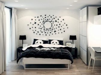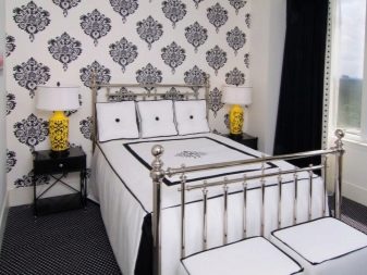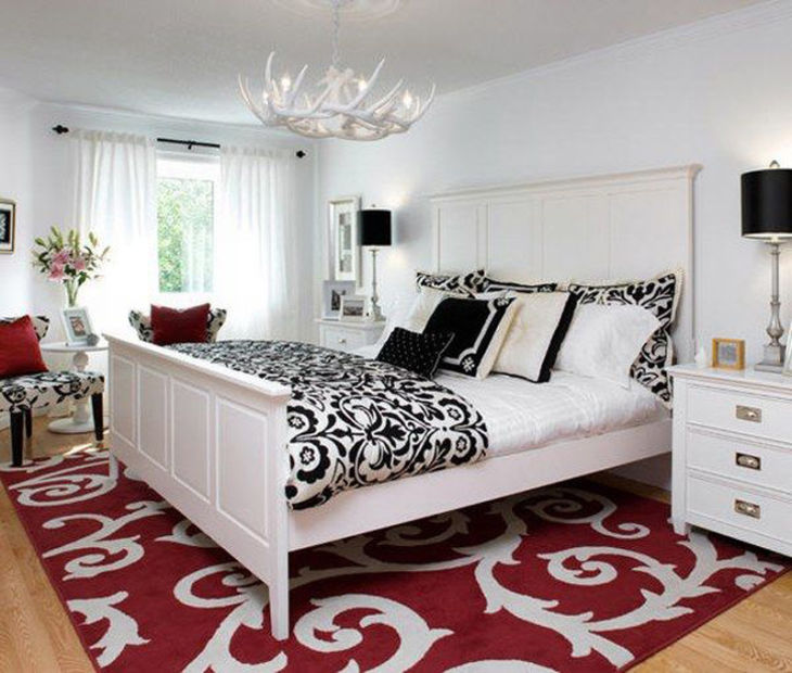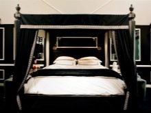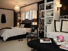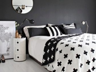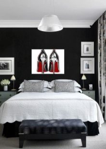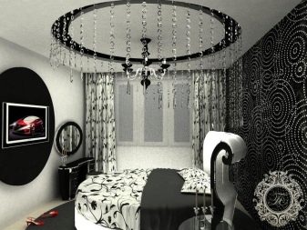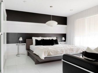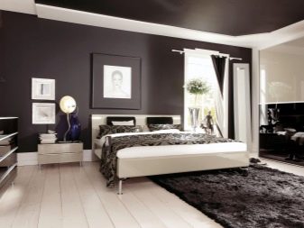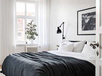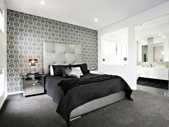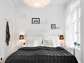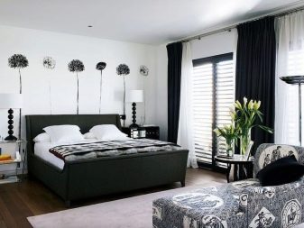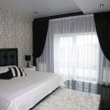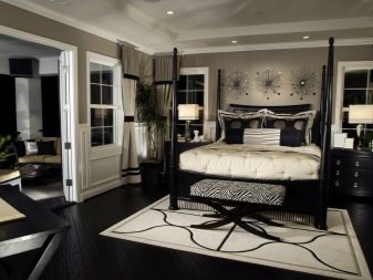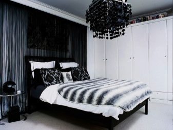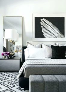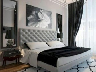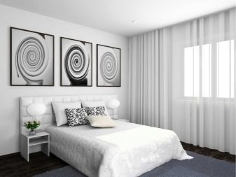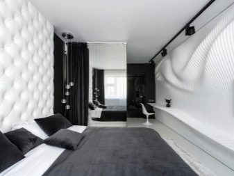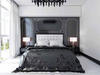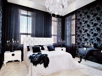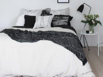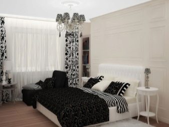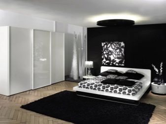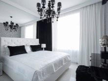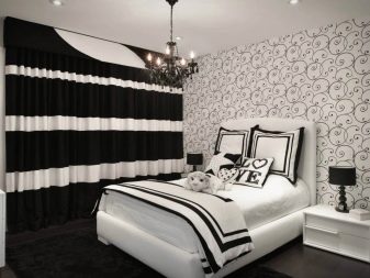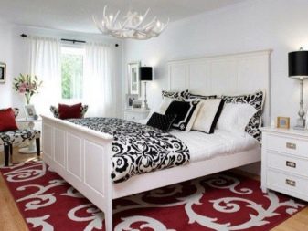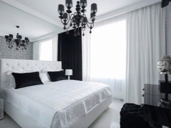 Per quanto riguarda le opzioni tessili, il lino satinato può essere utilizzato in combinazione con un baldacchino. Un eccellente accento di una camera da letto in bianco e nero sarà un tappeto rosso vivo, viola o di un altro colore. Poiché stiamo parlando di un interno contrastante, puoi diluirlo con vari decori, ma è importante non esagerare. Basta scegliere quadri alle pareti, una statua da terra o un vaso decorativo.La tappezzeria dei prodotti di arredo diventerà un elemento di arredo a tutti gli effetti, non solo un disegno nero su uno sfondo bianco, ma anche un ornamento floreale, a seconda delle preferenze personali.
