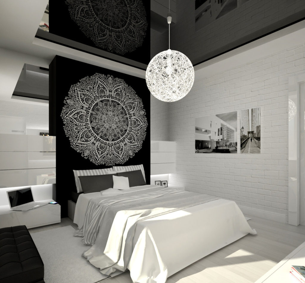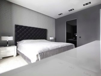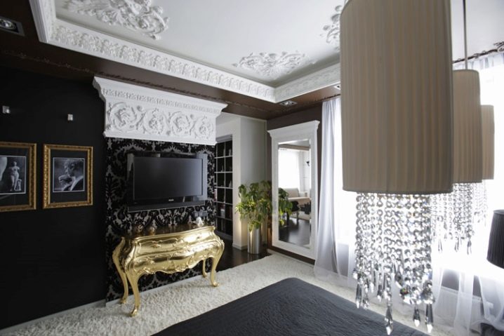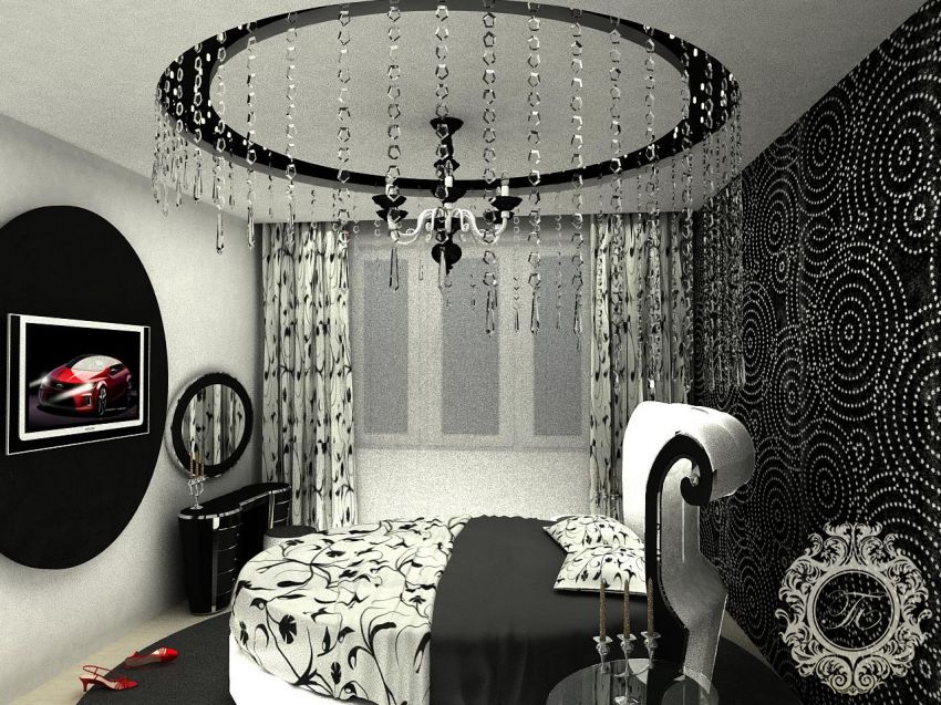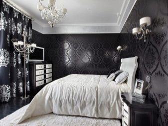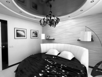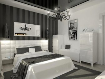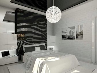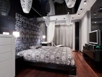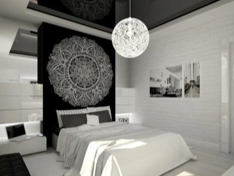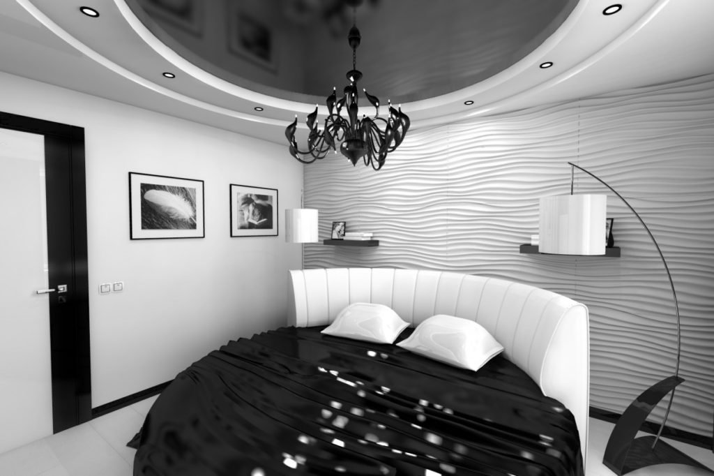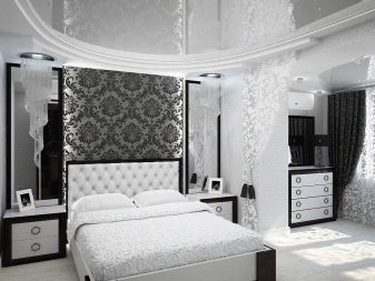 Non tutti si adatteranno a un soffitto scuro, quindi vale la pena considerare una finitura in cartongesso che può creare più livelli e nascondere gli apparecchi di illuminazione per un bell'effetto. La modanatura dello stucco è la scelta perfetta per un interno aristocratico in bianco e nero della camera da letto. Pertanto, i soffitti tesi lucidi o opachi o l'intonaco ordinario sono adatti per un tale design, i più audaci possono scegliere la carta da parati con un bellissimo motivo che si fonde armoniosamente con tutto il resto.