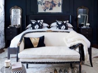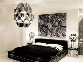 - Le persone creative amano l'Art Décoche presenta accenti artistici e mood. Per una camera da letto in bianco e nero in questo stile, sono adatti mobili sofisticati, candelabri da parete e dipinti alle pareti, non negarti il piacere di mettere una scultura stravagante. Credenze e letto devono essere in legno pregiato, rivestiti con lacca nera; sono gradite finiture dorate. È meglio scegliere la pelle bianca come la neve come rivestimento, decorandola con tessuti vintage. La presenza di accessori antichi starà bene in una camera da letto del genere. Lo stile Art Déco è enfatizzato da specchi in una cornice d'argento, maniglie forgiate su mobili e porte.