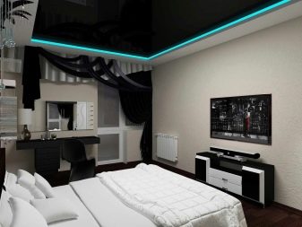 La scelta del colore per il soffitto gioca un ruolo importante, ma qui puoi andare oltre i classici. Un soffitto teso nero opaco combinato con un'illuminazione spot creerà l'effetto di un cielo stellato e la mancanza di luce sarà compensata dal pavimento e dalle pareti. Se dai un'occhiata più da vicino a questa opzione e usi anche mobili neri, sembrerà essere a gravità zero.