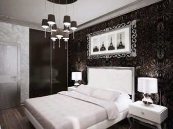 - Le pareti decorate con carta da parati decorata e candelabri sui comodini aggiungono eleganza agli interni.
