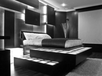 - L'avanguardia si adatta alle persone con un pensiero fuori dagli schemi, individui creativi che vogliono esprimere la propria spontaneità anche in casa. Non ci sono regole qui, puoi sperimentare secondo i tuoi gusti. Un'idea interessante sarebbe quella di installare un letto su un podio. L'illuminazione deve aderire ad una distribuzione uniforme lungo tutto il perimetro con la possibilità di regolare il flusso luminoso. L'arredamento può essere discreto e funzionale allo stesso tempo.